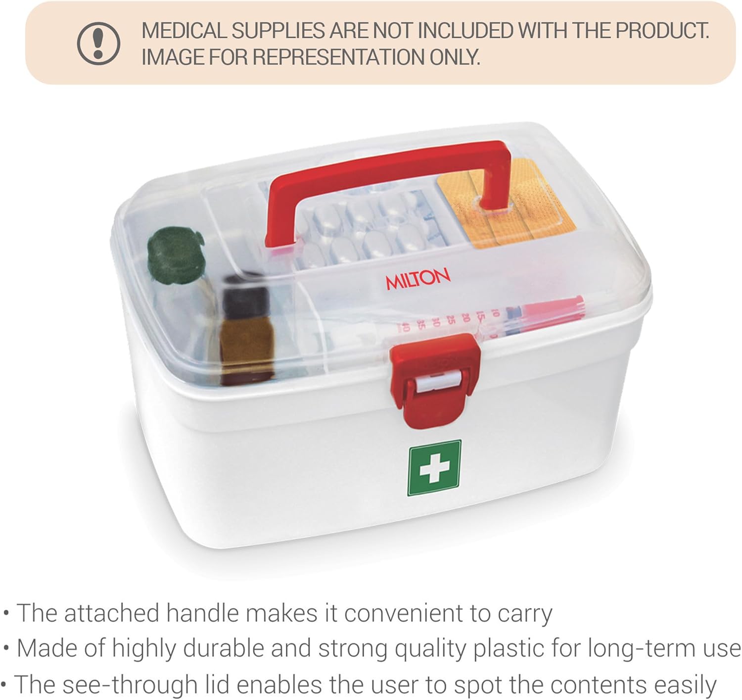 The Milton Plastic Medicine Box set of 4 is the ultimate solution for organizing and storing medical supplies safely and securely. Ideal for both indoor and outdoor use, this first aid box ensures that you’re always prepared for emergencies. Whether at home, the office, or on the go, these compact, transparent boxes are designed to keep your medical supplies neatly organized and easily accessible. Crafted from high-quality, durable plastic, the Milton Medicine Box features a clear, transparent design that allows you to quickly see the contents inside, making it easy to locate what you need during an emergency. Each box includes a detachable tray that divides the box into two sections, offering an organized way to store small medical items like band-aids, tablets, or ointments. This partition ensures that your supplies are segregated and easy to find, reducing the time spent searching for items in an emergency. The Milton Medicine Box is designed with a secure lockable closure, keeping your supplies safe and preventing unauthorized access. This feature is especially useful in households with children or pets, as it ensures that medications and medical tools are kept out of reach. Additionally, the portable handle makes it easy to carry the box wherever you need it, whether you're traveling, on a camping trip, or simply moving it from room to room. Versatile in its use, this medical box can be used for much more than just first aid supplies. It’s perfect for storing small items like jewelry, craft supplies, or travel essentials, adapting to your unique needs. The set of 4 boxes provides ample storage options, allowing you to keep first aid kits in multiple areas or organize various small items efficiently. The Milton Plastic Medicine Box is a practical, durable, and secure storage solution, offering convenience and peace of mind when you need it most.