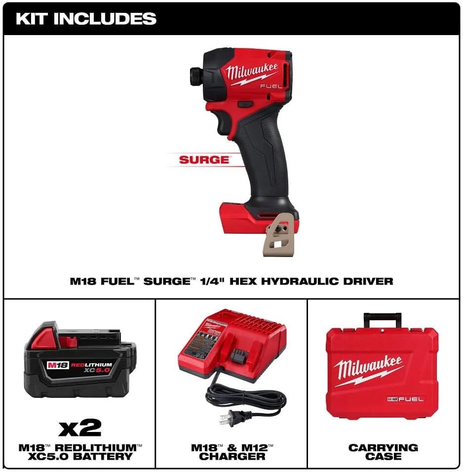 Included Components (1) M18 FUEL SURGE 1/4" Hex Hydraulic Driver (2761-20), (2) M18 REDLITHIUM XC5.0 Extended Capacity Battery Pack (48-11-1850), (1) M18 & M12 Multi-Voltage Charger (48-59-1812), (1) Carrying Case, (1) Belt Clip