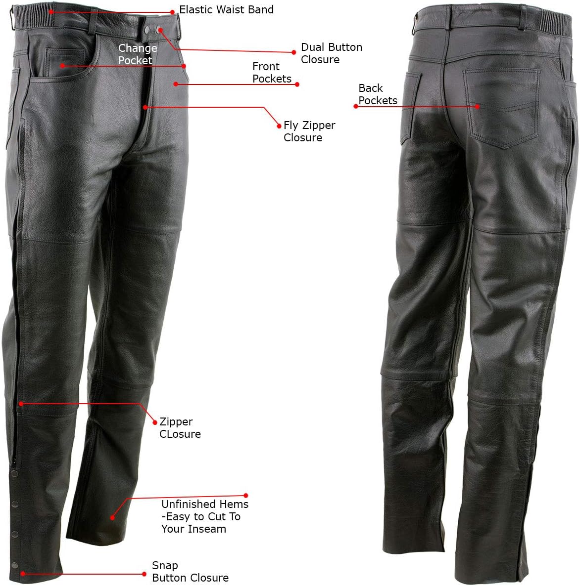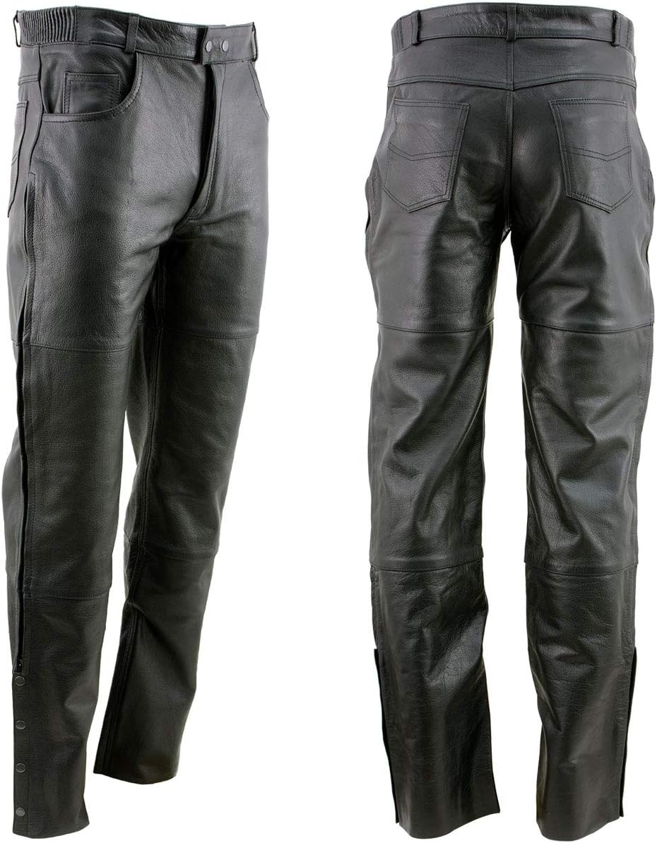 Milwaukee Leather LKM5726 Men’s Black Premium Leather Motorcycle Over-Pants with Side Zipper and Snaps Features Made of Premium Cowhide 1.2mm Thick Leather 5 Pocket Jean Style Over Pants Zipper Leg Closures With Snap Buttons On The Bottom 2 Snap Button Closure With Front Fly Zipper Fully Lined So The Leather Will Not Stain Your Pants Elastic Comfort Sides On Waist On A For Better Fit Unhemmed - Cut to Your Height YKK Black Metal Zippers Genuine YKK Zippers-Known for Longevity and Durability We Advise Ordering ONE Size Up Then What You Normally Wear For Pants, As This Item Is Fitted Milwaukee Leather - Established 1991! Once You Have It, You'll Love It! The Milwaukee Leather Premium Leather Motorcycle Over Pants with Side Zipper and Snap Closure, These Pants Are Made of Premium High Grade Cowhide Leather, Are Meant to Be Worn Over the Pants, They Come with Side Zippers and Snaps to Remove Easily. They Feature Jean Style 5 Pocket Design; Unfinished Hems, They Are Fully Lined So the Leather Does Not Stain the Pants, Elastic Comfort Sides on The Waist for A Comfortable Fit and A 2-Snap Button Front Closure with Front Fly Zipper.
