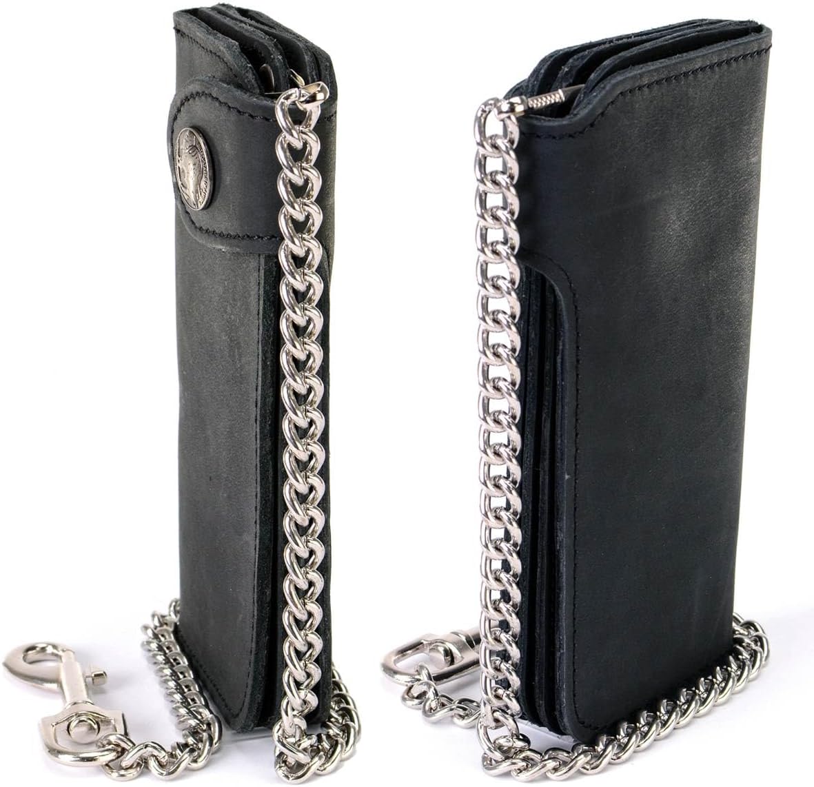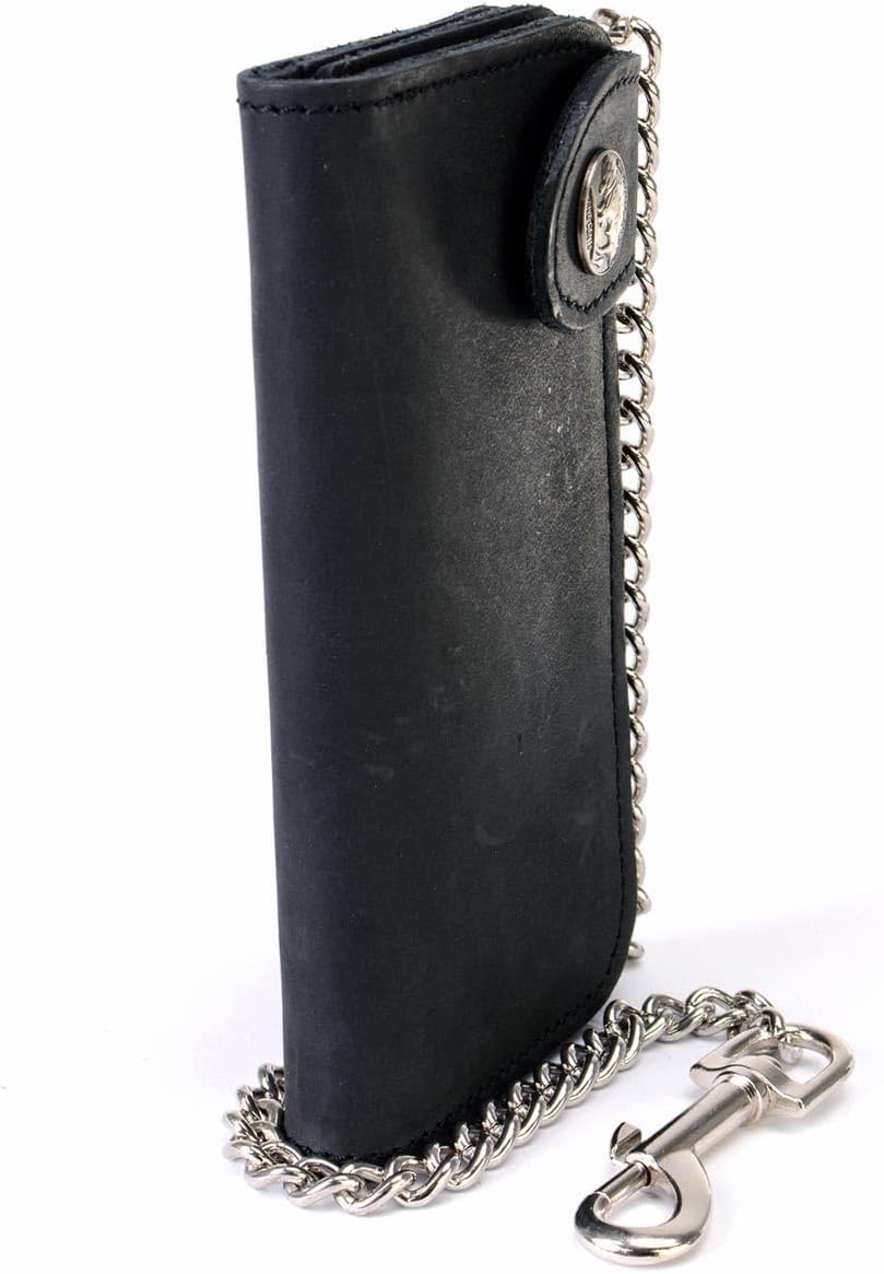 Milwaukee Leather MLW7828 Men's 6" Leather Bi-Fold Biker Wallet w/ Anti-Theft Stainless Steel Chain and Buffalo Nickel Snap Features Men’s Bifold Wallet with Buffalo Nickel Snaps: Our Men’s Long wallet with chain is hand made to perfection and made from full-grain leather. This Men’s bifold black wallet has a leather snap belt clip & comes with a 10 gauge, 12” steel chain that can be attached to a belt loop or other secure point to prevent loss or theft while riding your motorcycle. Storage Capacity: This Men’s wallet includes 9 slots pocket holding for credit card Picture and ID. When leather wallet with chain opens it measures 7 inches. Leather biker wallets are known for their exceptional durability, as high-quality leather is resistant to abrasion, and other forms of damage, making it a reliable choice for bikers. Biker Wallet with Removable Chain: Our Black wallet for men with chain is made from heavy duty, 100% full-grain cow leather & and is built to last and designed with removable chain! This trucker wallet has a 12” long stainless-steel chain that securely clips into your belt loop & has snap closures & zipper Closure for added security. Perfect Gift for Biker: This bifold genuine leather wallet will be a great gift for your father, husband, brother, boyfriend or any other male biker and trucker. Get that rider in your life, something they will love and use every day! Milwaukee Leather is a well-known biker apparel company that has been providing top-quality leather jackets, chaps, boots, wallets, helmets, and other accessories for bikers since 1991. We take your safety very seriously. We make sure that each item that bears our name is built to last and offer the protection that riders need to stay safe on the road.