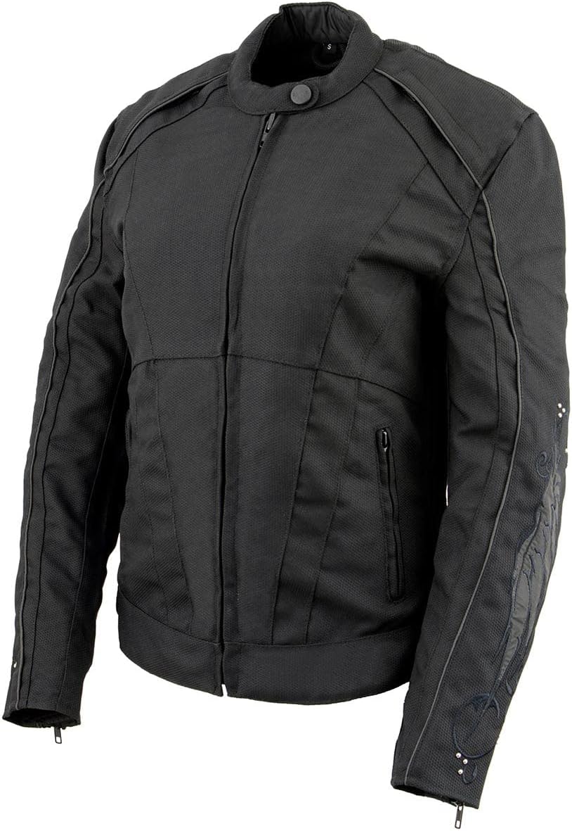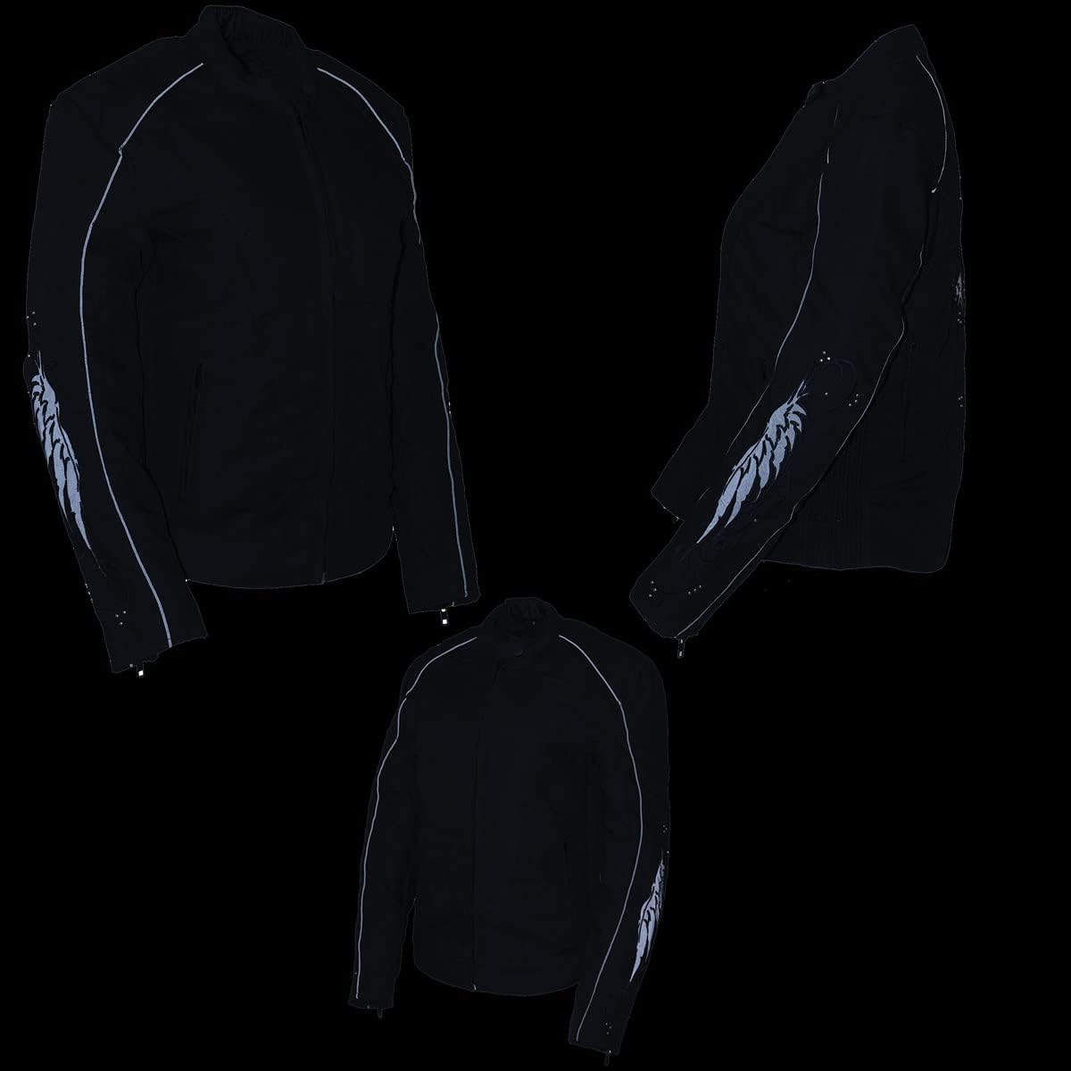 Milwaukee Leather MPL1954 Women's 'Studded Wings' Black Textile Moto Jacket Features Made of 1300D Nylon Material Full Sleeve Zip Out liner Hidden Zippers Give a Clean Look Full Height Side Stretch Panels for a Perfect Fit at Any Size Conceal and Carry Your Piece with Dual Inside Left and Right Storage Pockets (Can Be Used as Regular Large Storage Pockets If You Don’t Carry) Generous Closeable Air Vents on Shoulders with Two Back Vents Embroidered Wing and Stud Design on Arms and Back Action Shoulder Back Panel Perfect for Riding Movement Full Arm and Shoulder Blacked Out Highly Reflective Piping Genuine YKK Zippers -Known for Longevity and Durability Built Inside Hanging Loop Built Inside Mesh Lining Milwaukee Leather: Made for Riders, Built to Last