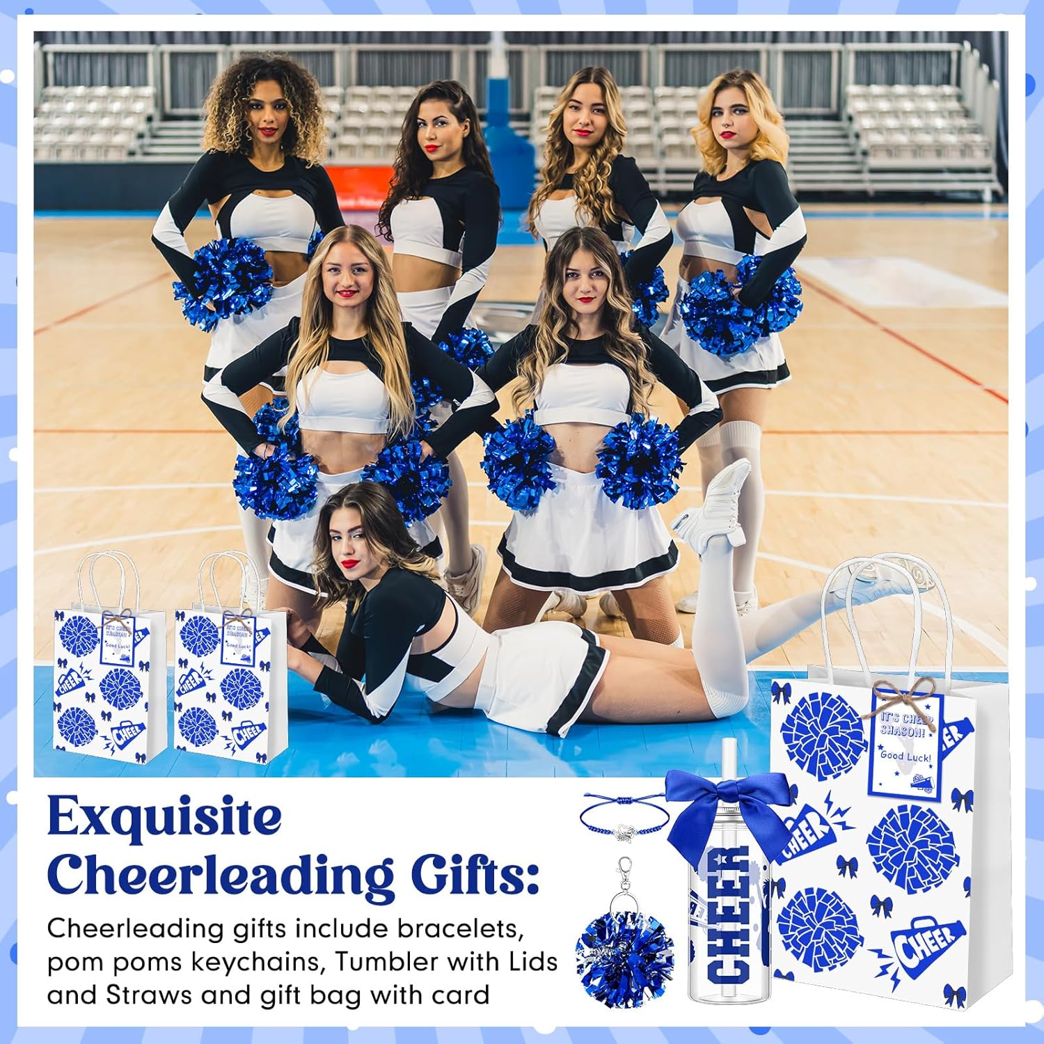 Features: Cheerleading Exclusive Gift Bags: The bright colors and innovative designs of the cheerleading gift bag set make it a great gift for cheerleading members. Meet the needs of team sharing and personal use: Cheerleading gifts in bulk are ideal as gifts for cheerleaders or sports fans to express recognition and respect for their hard work and dedication. Specifications: Material: Color: blue Size: Cheer Bow Water Bottles about 13.5 oz/ 400 ml Paper tote bag about 6 x 3 x 8 inches/ 15 x 8 x 21 cm Keychain diameter about 1 inch/2.5 cm Pom pom diameter is about 4.33 inches Package includes: 12 X Cheer Tumbler Cups 12 X Cheer Pom Pom Keychain 12 X cheer bracelets 12 X Cheer gift bag 12 X Cheer gift card Notes: Manual measurement, please allow slight errors on size. The color may exist a slight difference due to different screen displays.
