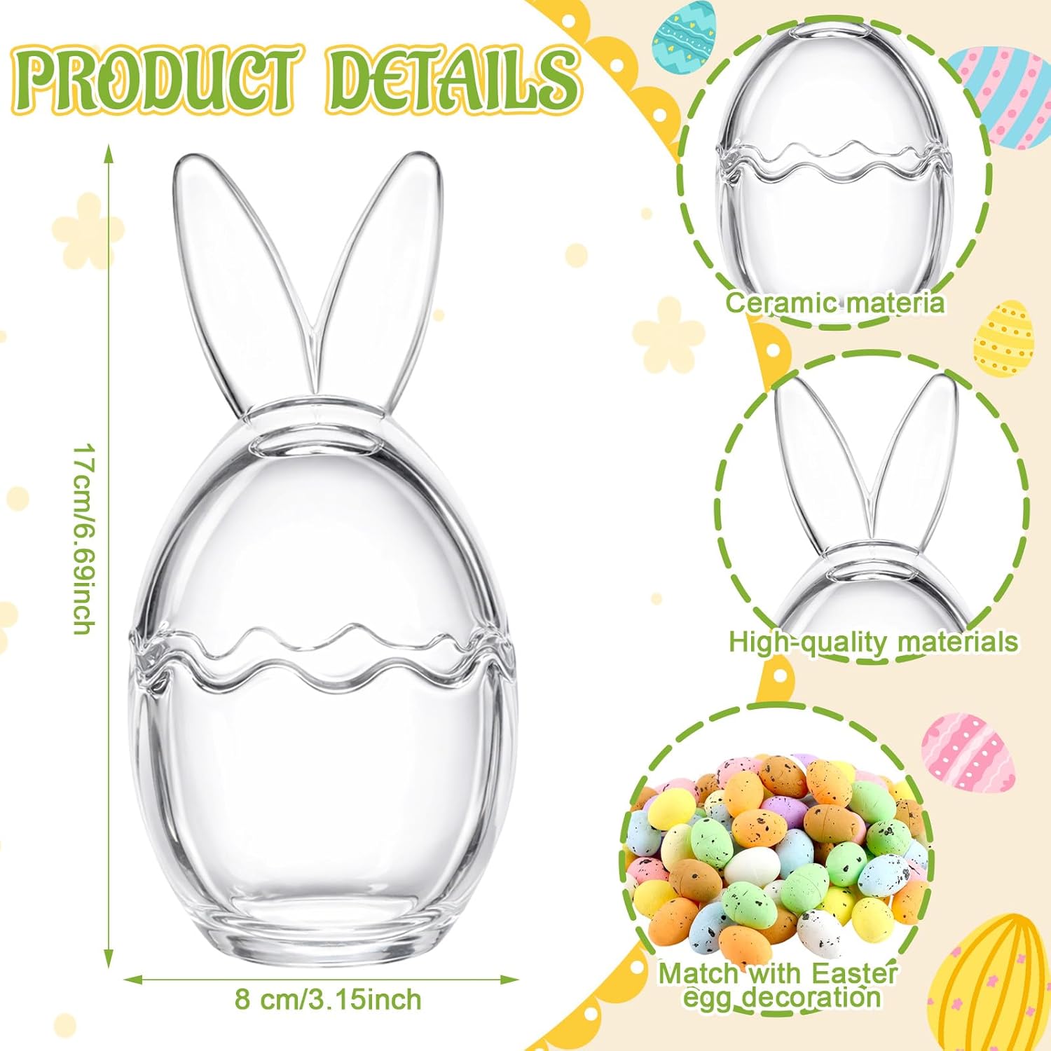 Features: Elevate Your Decor: This easter candy container is ideal for sprucing up your dining table, kitchen, and party decorations, or as a thoughtful gift during Easter and times of joy. Let the cheerful colors lift your spirits and infuse your home with hope and happiness. Scope of application: Present the easter cute container to your dear ones on various occasions, and spread warmth and joy in their surroundings. It's ideal for adding a festive touch on shelves, mantels, party tables, and dessert tables, making every celebration more memorable. Specifications: Material: glass, ceramic, foam Color: transparent Size: Easter egg jar: 2.95 x 6.69 inches / 7.5 x 17 cm. Capacity: 8.45 oz / 250 ml Foam easter Egg: 0.71 x 0.98 inches / 1.8 x 2.5 cm Package includes: 3 x Easter egg jar 100 x Foam easter Egg Notes: Manual measurement, please allow slight errors on size. The color may exist a slight difference due to different screen displays