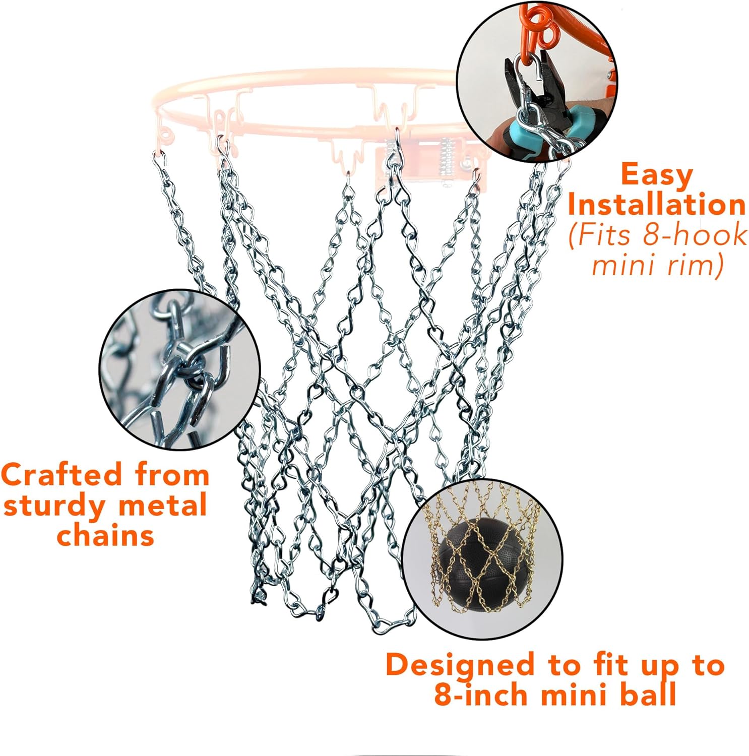 Elevate your indoor basketball experience with this durable and sleek chain basketball net. Crafted with sturdy metal construction, this net is designed with chain links create a captivating visual appeal, adding a touch of style to your basketball setup.