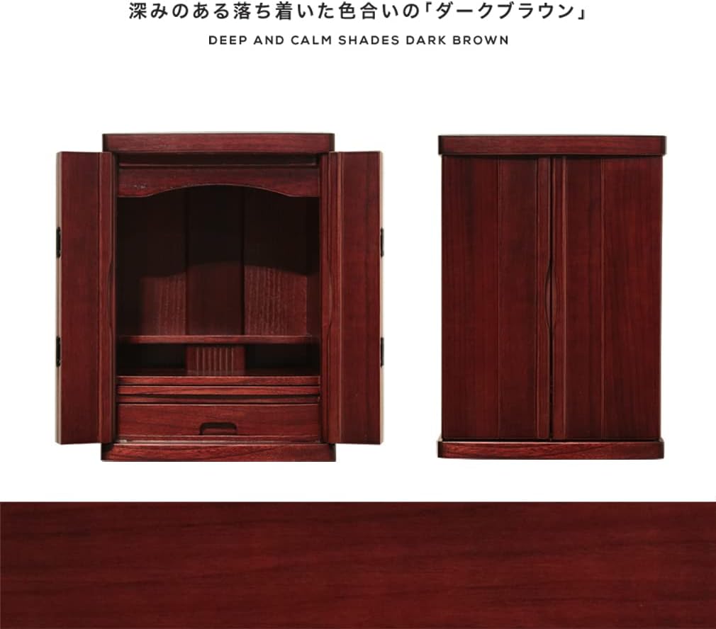■ Product size: Width 32 × depth 25 × height 45 (cm) First dimension of inside dimension: width 28 × depth 8.5 × height 25.5 (cm) Inner dimension 2nd step: width 28 × depth 11.5 × height 31.5 (cm) Drawer inside dimension: width 25.5 × depth 17 × height 3 (cm) Slide shelf: width 27.8 × depth 18 (cm) "effective area about 11 cm" * The shelves inside the Buddhist altar are fixed. ■ Material: natural wood (paulownia) ■ Painting: urethane resin coating Weight: 3.5 kg (approx) Finished Goods