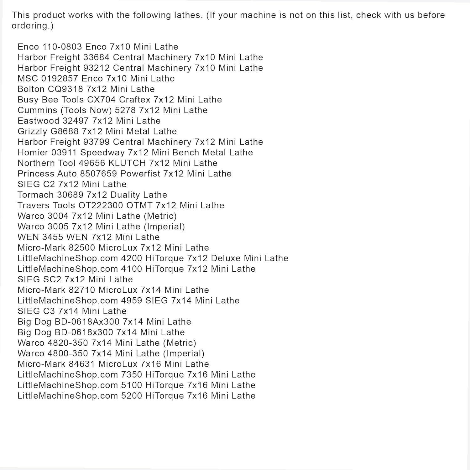 Complete set of good-looking steel change gears for the mini lathe. The gears have a 12 mm bore and a 3 mm keyway. The width (thickness) of each gear is 8 mm.These gears all have teeth complying with ISO Module 1 standard.This set includes the following gears: - 1 30 Tooth gear - 1 35 Tooth gear - 2 40 Tooth gear - 2 45 Tooth gear - 1 50 Tooth gear - 1 55 Tooth gear - 1 57 Tooth gear - 1 60 Tooth gear - 1 65 Tooth gear - 2 80 Tooth gearTip: Our mini lathe change gears have a 3 mm keyway. Some lathes have 4 mm keys. It only takes a few moments with a file to expand the keyway to fit a 4 mm key.This set of mini lathe gears are compatible with popular SIEG C2, SC2 and C3 classes of mini lathes from Harbor Freight, Grizzly, Cummins, Homier, Micro-Mark and others.