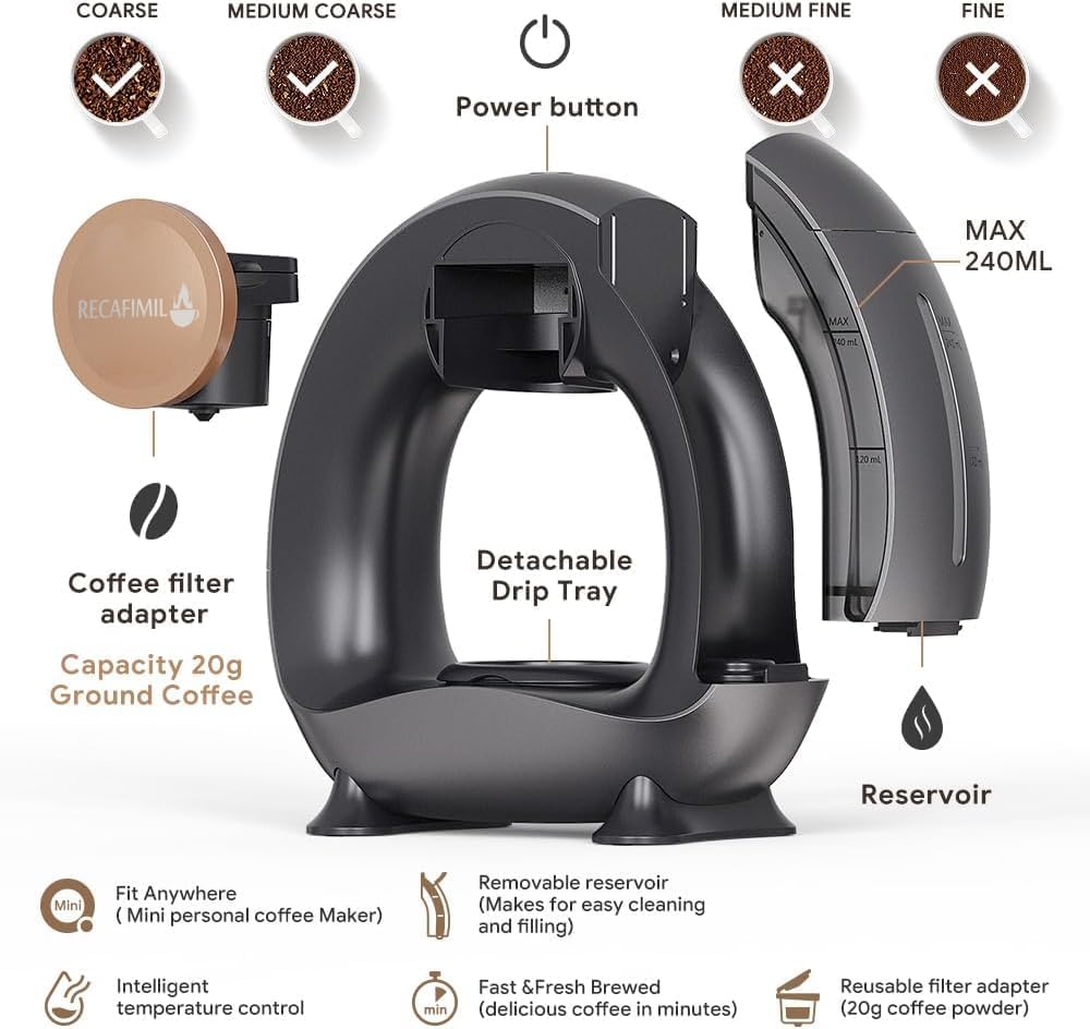 Discover the ultimate convenience and versatility with the MINI Q 2-in-1 Single Serve Coffee Maker. Designed to brew both K-Cups and ground coffee, this compact coffee brewer allows you to enjoy your favorite beverages just the way you like them. With a sleek and modern design, it fits seamlessly into any kitchen, office, or dorm room. Equipped with intelligent temperature control, the MINI Q ensures your coffee or tea is brewed at the perfect extraction temperature of 85℃, delivering a rich and flavorful experience with every cup. Whether you prefer a robust Americano or a delicate herbal tea, this machine caters to all your cravings. Choose your brew size with ease, ranging from 4 oz to 8 oz (120 mL to 240 mL), making it simple to create the ideal serving without any waste. The one-touch operation means you can have your drink ready in minutes—perfect for those busy mornings or quick breaks throughout your day. Designed for quiet operation, the MINI Q minimizes noise and vibrations, allowing you to enjoy a peaceful coffee experience without disturbances. Plus, its compact dimensions (9.5 x 5 x 10.2 inches) make it portable enough to take anywhere—be it your home, office, or even while traveling in an RV. Safety is a priority with the auto shut-off feature, which powers down the machine after 5 minutes of inactivity, helping to conserve energy and prevent overheating. Cleaning is a breeze with its BPA-free detachable parts, including a reusable filter and drip tray, ensuring you spend less time cleaning and more time enjoying your brew. Elevate your coffee experience with the MINI Q 2-in-1 Single Serve Coffee Maker—where convenience meets exceptional flavor. It also makes a thoughtful gift for coffee lovers in your life! Feel free to modify any sections to better fit your brand’s voice!