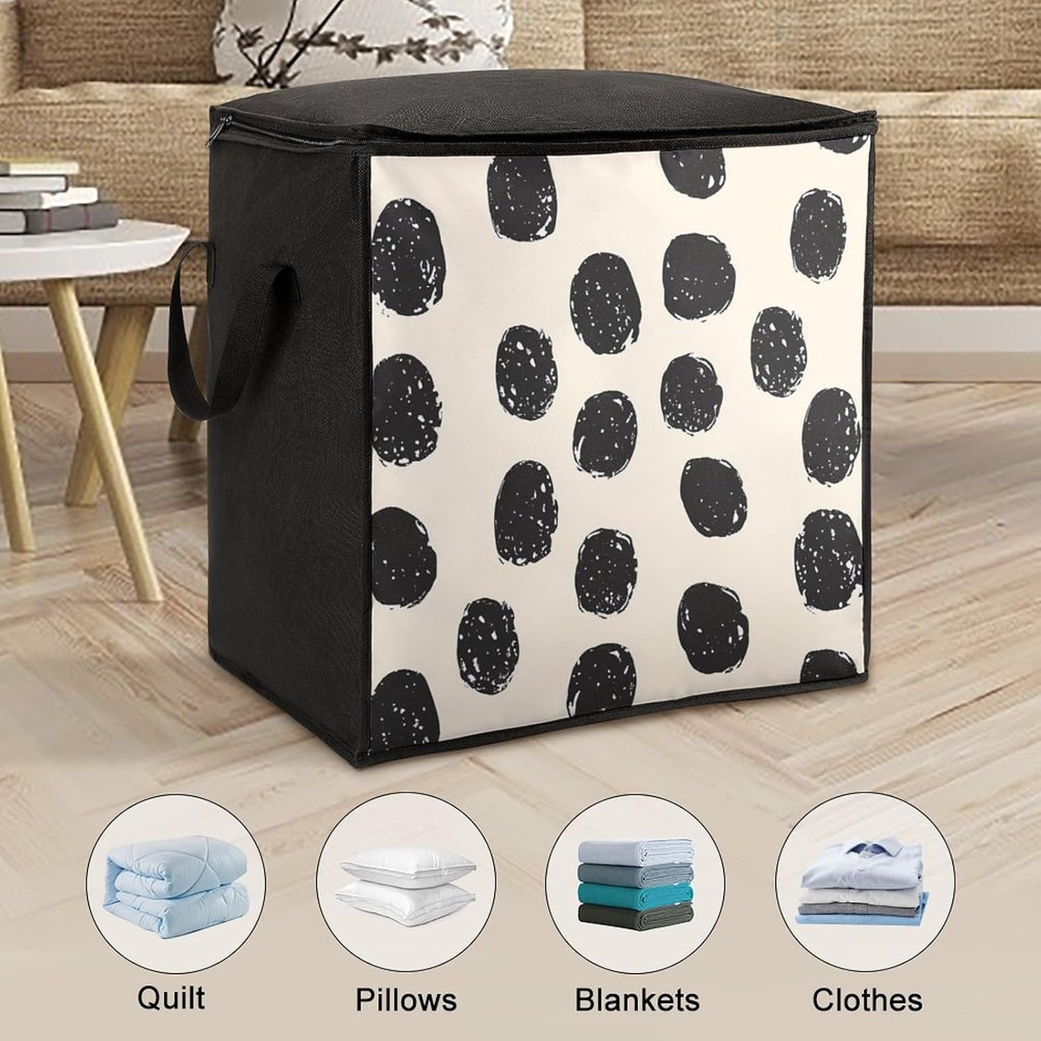 Make seasonal storage easy and efficient. This comforter storage bag is made of polyester material, which is strong and wear-resistant. It can protect your clothes and bedding from moisture and dust for a long time. The 70L large capacity can easily store heavy winter quilts, down jackets, blankets and other large items. The handle design makes moving more effortless