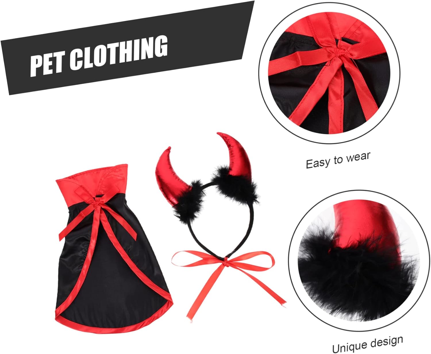 Package List 5 x Dog Halloween Cloak 5 x Dog Head Band Characteristics -Size: 22.00X16.00X2.00cm/8.65X6.29X0 Pet Cape. -You can send it to your friends who have pets, your friends will feel happy Halloween Party supplies. -Breathable and comfortable cape and head band set, which will not hurt your pet Devil Horns Headband. -Adorable Halloween costume for dogs and cats, which make more fun for them on the Halloween party and so on halloween puppy costume. -Simple in structure, very easy to wear and take off, also easy to adjust funny dog clothes. -Material: polyester pet prank costume -Color: Red and Black dog vampire costume -Suitable for most sizes of puppies and cats, to more Halloween atmosphere ghost festival dog cape.Goods InformationHalloween Dog Costume This pet costume is Halloween night party, appealing for pet dogs, can be easy to cosplay.dog cape and headband With chic design, your pet will look very fashion in the festival.holiday dog coat Even in daily life, this dress-up will the charm of pets, make pets look very cool