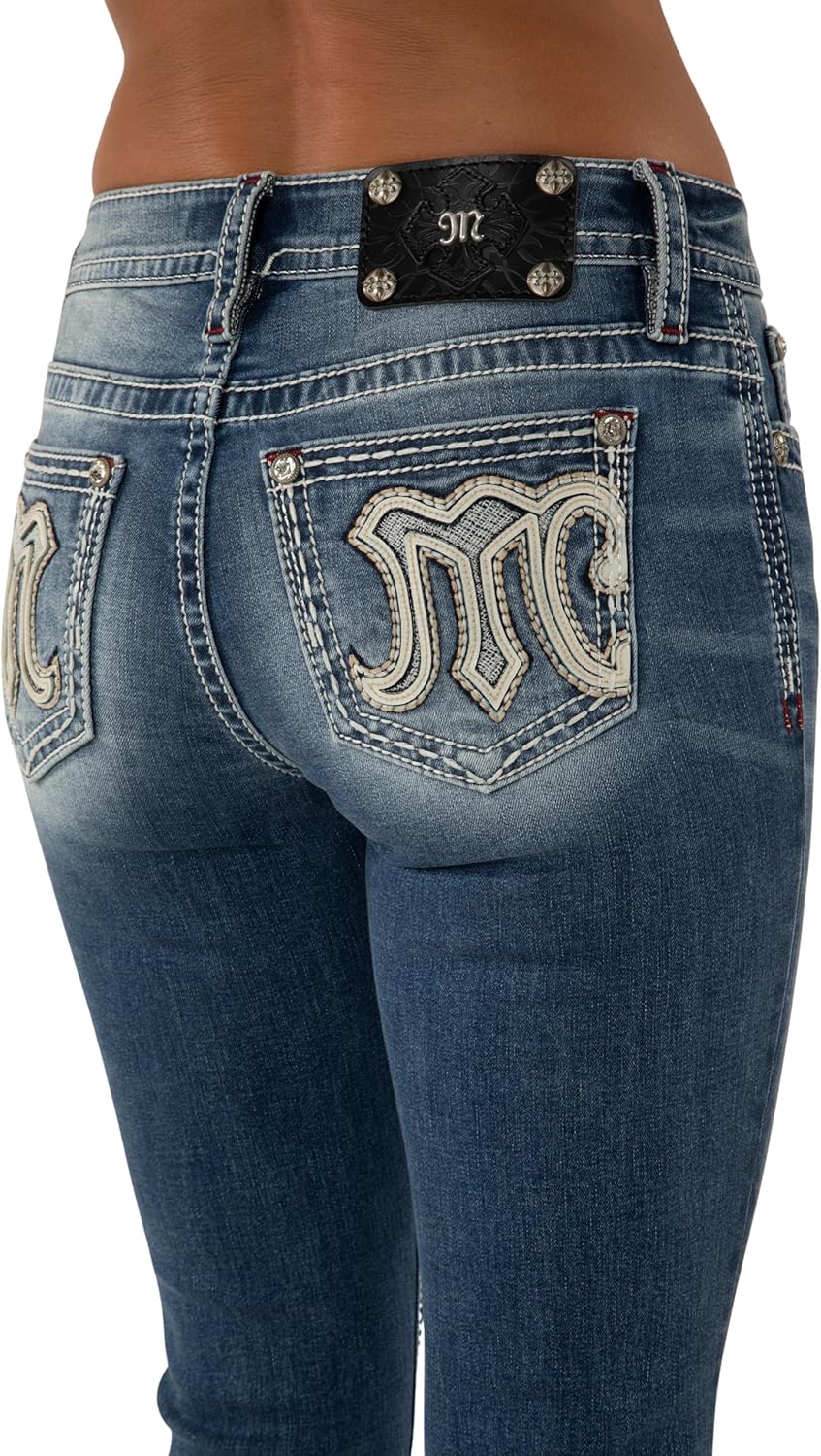 The Miss Me Women's Maven Logo Embellished Pockets Mid-Rise Bootcut Jeans are a bold blend of edgy flair and everyday comfort. Featuring signature Miss Me embroidery with a bold logo and studded embellishments on the back pockets, these jeans bring standout detail to your denim game. The medium blue wash, whiskering, and fading give them a lived-in feel, while the bootcut leg adds timeless western appeal that works with boots or heels alike.Designed for both fashion and function, the Miss Me Women's Maven Logo Embellished Pockets Mid-Rise Bootcut Jeans feature a flattering mid-rise fit, comfortable stretch denim, and a 5-pocket styling for classic utility. With high-contrast stitching, a black leather Miss Me patch, and a slim fit through the thigh that opens to a subtle flare, these jeans are made to elevate your wardrobe with effortless attitude and signature style.