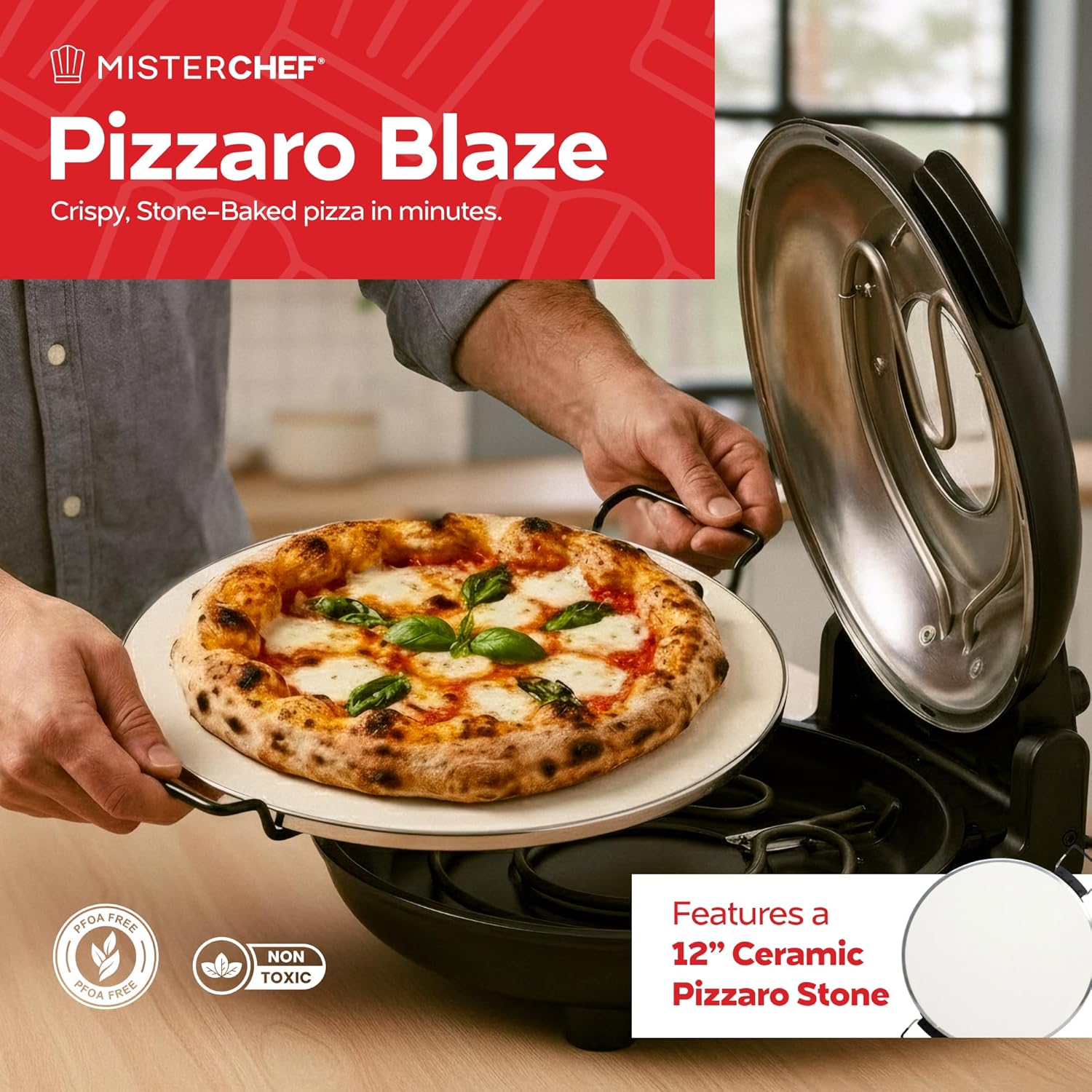 Enjoy authentic, crispy pizzeria-style crusts at home with our indoor pizza oven, which heats up to 800°F (426°C), much hotter than standard ovens, ensuring golden, evenly baked pizzas every time. Its dual temperature control allows separate top and bottom heating, giving you a perfectly crisp crust and well-cooked toppings without burning or undercooking, while the built-in viewing window lets you watch your pizza cook without lifting the lid, keeping heat sealed inside and maintaining a consistent temperature for flawless results. This portable pizza oven features a non-stick ceramic stone with easy-lift handles, making it simple to remove, carry, and serve your pizza straight to the table. The package includes 2 wooden pizza peels and a slicer for effortless transferring, serving, and cutting of homemade pizzas. Ideal for pizzas up to 12” (30 cm), it is also perfect for flatbreads, quesadillas, roasted vegetables, cookies, and pastries, providing a versatile, all-in-one cooking experience for your countertop. Features Rapid heating up to 842°F (450°C) Dual temperature control for even cooking Built-in viewing window for monitoring Non-stick ceramic stone with easy-lift handles Includes 2 wooden pizza peels and slicer Perfect for pizzas up to 12” (30 cm) Versatile for flatbreads, quesadillas, roasted vegetables, cookies, and pastries