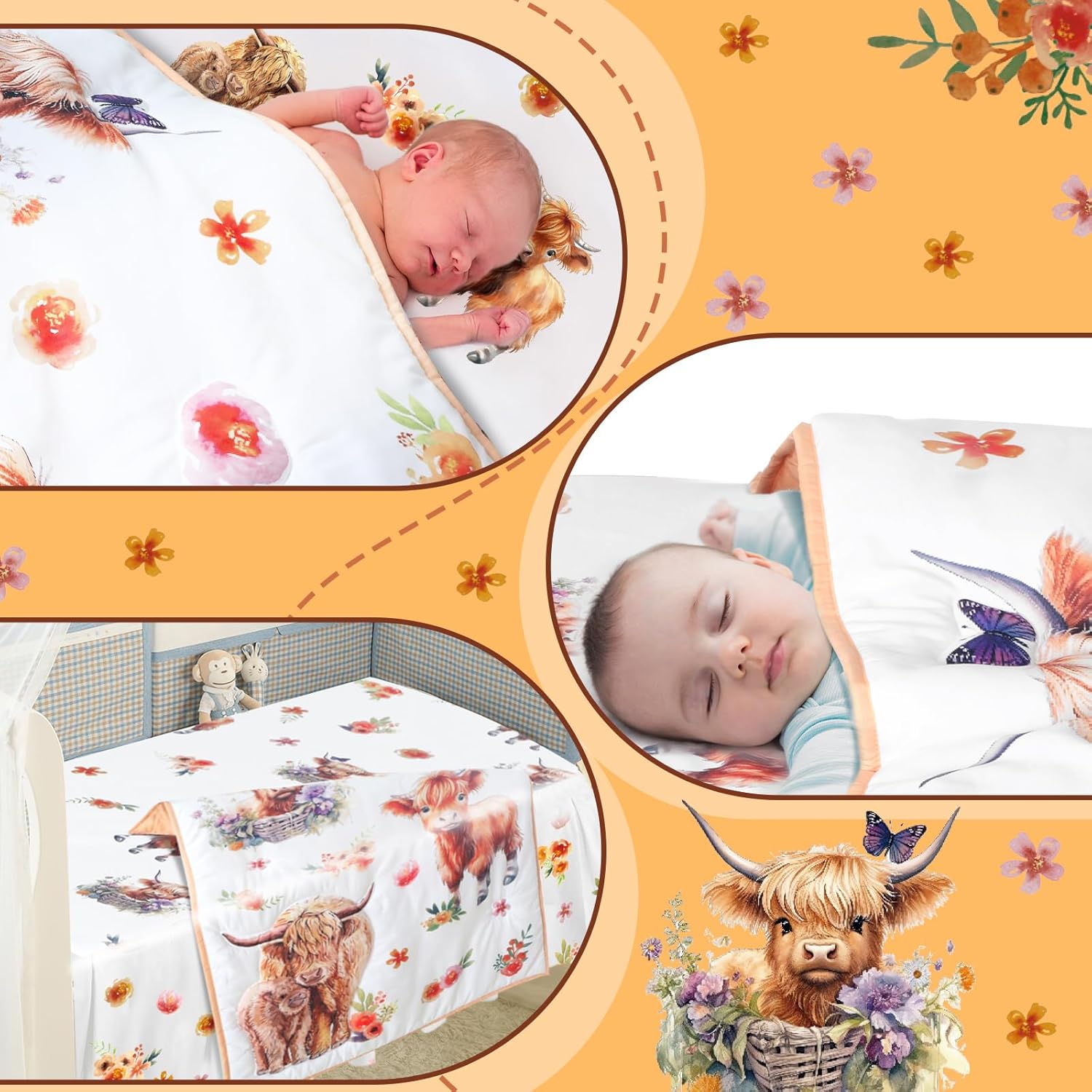 Features: 3 Pieces bear crib bedding set: This set includes a mini comforter, a yellow fitted sheet, and a crib skirt, all decorated with cute mountain cow flowers designs. Breathable and soft: Gentle for baby's delicate skin. The comforter provides warmth and comfort during chilly nights for your baby. Specifications: Material: polyester Color: shown as pictureSize: Fitted sheet: 28 x 52 x 8 inchesComforter: 32 x 42 inchesCrib skirt: 27 x 51 x 10 inchesPackage includes: 1 x Fitted sheet 1 x Comforter 1 x Crib skirt Notes: Manual measurement, please allow slight errors measurement. The color may exist a slight difference due to different screen displays.