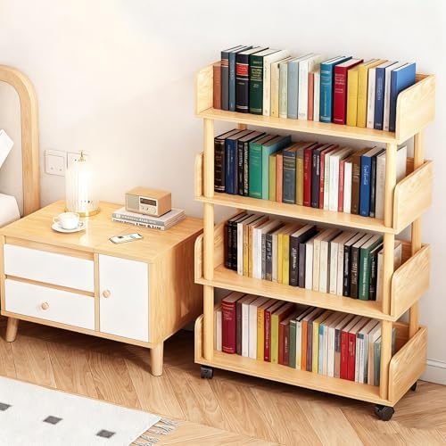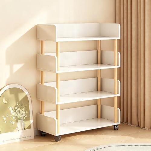 ——This rolling bookshelf is a modern and elegant storage solution perfect for any home or office. Made with solid wood legs and padded wood grain finish, it complements any decor. ——The spacious open shelves and smooth-rolling wheels provide the perfect balance of organization and mobility for any room in your home. Whether you need to store books, toys, office documents, or kitchen essentials, this versatile organizer makes storage effortless and easy to access. 【Key Features】 ^Open shelves with 30cm spacing provide ample vertical storage space. ^Castors allow for easy mobility, and locking brakes keep the cart securely in place. ^Raised sides prevent books and belongings from falling. ^An ideal gift to encourage reading and organization in children. 【Product Specifications】 ^Product Name: Rolling Bookshelf / Library Cart / Rolling Book Cart with Wheels ^Material: Solid Wood + MDF ^Height: 110cm / 43in ^Number of Shelves: 4 ^Package Includes: 1 Bookshelf, Installation Accessories