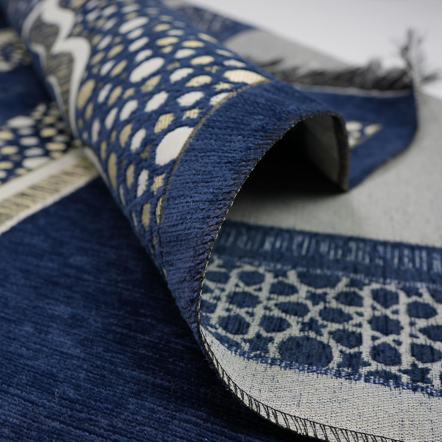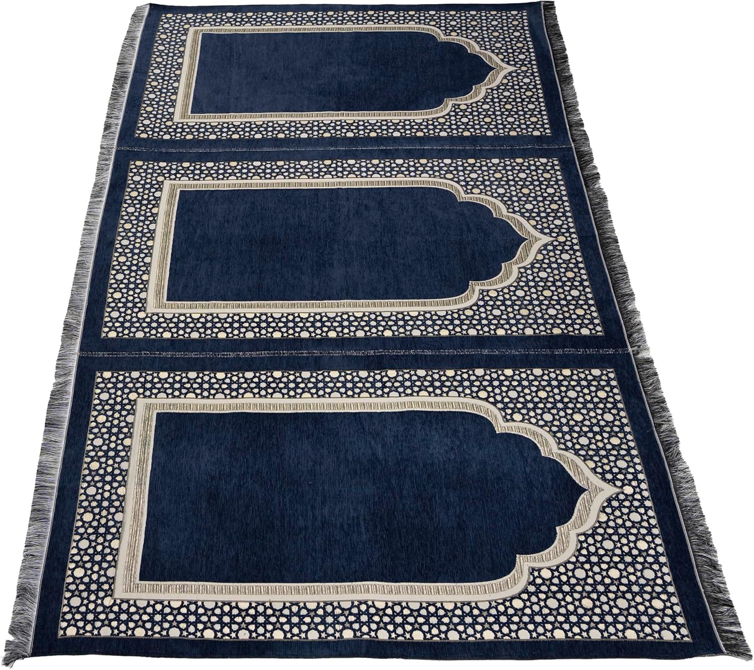 This wide 3-person Islamic prayer mat from Modefa brings families and communities together for worship with its spacious design and beautiful Selcuk star pattern. Featuring elegant chenille embroidery with geometric Islamic motifs, this multiperson janamaz is perfect for mosques, Islamic centers, or family prayer gatherings. The lightweight construction makes it incredibly portable and easy to fold, ideal for transporting to large events or storing when not in use. Machine-made with hand-finished details, each prayer mat is carefully inspected to ensure quality craftsmanship. Measuring 82.7 inches by 47.2 inches, this rectangular prayer carpet accommodates three worshippers comfortably. The medium pile velvet surface provides a soft feel, while the polyester backing adds durability. With a thickness rating of 4 out of 10, this thin mat is best suited for use on carpeted surfaces or with additional padding on hard floors. The classic arch design and decorative border make this sajjada both functional and visually appealing for daily prayers or special occasions.