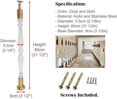Elevate your home’s safety and style with our premium metal balusters and modern acrylic handrails, perfect for updating your deck or staircase. Designed to harmonize with any setting, these balusters are an ideal choice for both indoor and outdoor environments. Our wall-mounted acrylic handrail provides essential support for children, seniors, and individuals requiring assistance while navigating stairs. This small investment significantly enhances safety and accessibility in your home, making it easier for everyone to move confidently up and down stairs. Featuring a sleek and contemporary design, the acrylic crystal handrail is an excellent addition to your indoor staircases, transforming them into a centerpiece. Whether you are renovating your garage, basement, hallway, or porch steps, our handrails offer a versatile solution that is easy to install and reposition. **Specifications:** - **Material:** Acrylic and Stainless Steel - **Color:** Clear and Gold - **Diameter:** 5.5cm (2 1/8in) - **Base Diameter:** 9cm (3 1/2in) - **Height Options:** 80cm (31 1/2"), 85cm (33 1/2"), 90cm (35 3/8") **Features:** - High-quality, waterproof acrylic construction suitable for indoor and outdoor use. - Each handrail supports a load capacity of up to 400lbs (200kg). - Designed for horizontal, inclined, or vertical applications, perfect for DIY enthusiasts seeking affordable decking solutions. - The elegant satin black powder-coated finish complements any decor style. **Versatile Applications:** - Ideal as a door handle pull in bathrooms or kitchens, a towel holder, bath grab bar, or even for hanging other items. - Includes all necessary hardware for installation on concrete, tile, or various wall types. - Suitable for diverse indoor settings, enhancing the aesthetics of bathrooms, kitchens, balconies, and more. Our acrylic handrails are particularly beneficial for families, offering stability for children, seniors, pregnant women, and individuals recovering from surg...