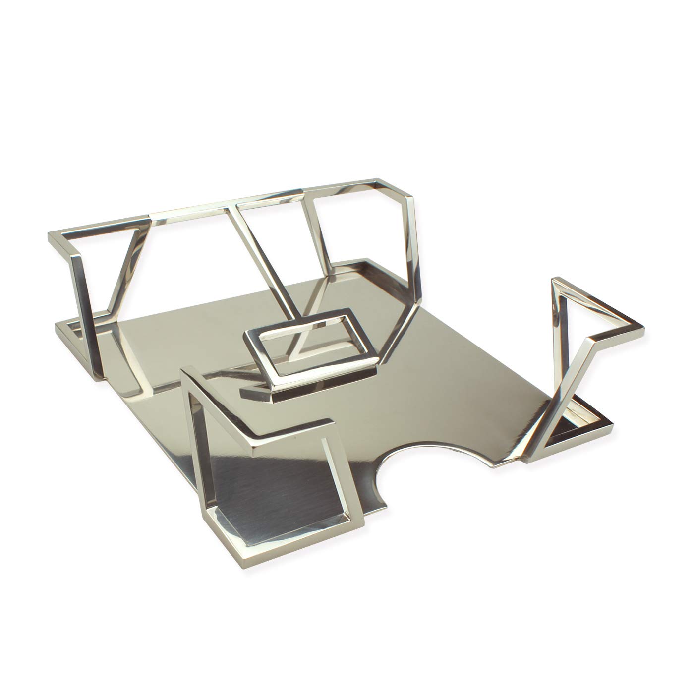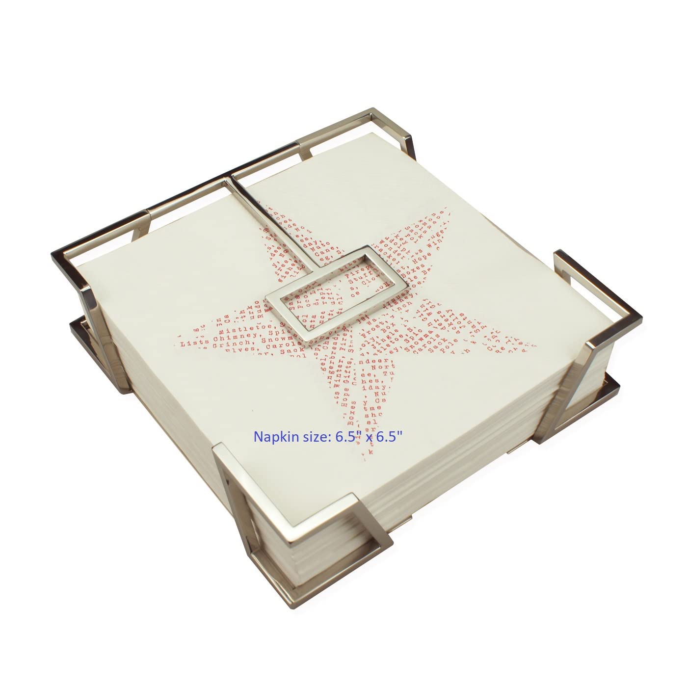 Created by New York modern art designer L.W., this product is not only a napkin holder but also a work of modern art. Its pivoting arm is so weighty that it can keep napkins in place no matter it is under a fan, near a window or even in open air. The design having a wide-open front and leaving plenty space from the front to the arm makes hand pulling a napkin super easy. The arm is secretly designed removable. By pulling apart 3/16"" at the joint between the arm and corner structure, the arm can be removed. Made of high quality stainless steel it is crafted with cutting-edge workmanship. Fit standard 6.5""x6.5"" square folded dinner, lunch or luncheon napkins (If want to fit 5""x5"" cocktail/beverage napkins, buy st215 or mr115.). Packed in a gift box it can be a perfect gift for any occasions. At the bottom a secret code is laser engraved which hides important collectible information. Decoding is provided in a small booklet with the product. It has 4 pads on the bottom to prevent scratching. Lift the arm gently when replacing napkins to avoid the arm touching other objects. Napkins are not included. (Notes to the arm removal: 1. Pull gently and slowly (not too wide) to avoid damaging the product. 2. Not to remove it too often to avoid damaging the joint. 3. When replacing napkins, hold the arm to avoid it hitting any objects backward, like table surface.)