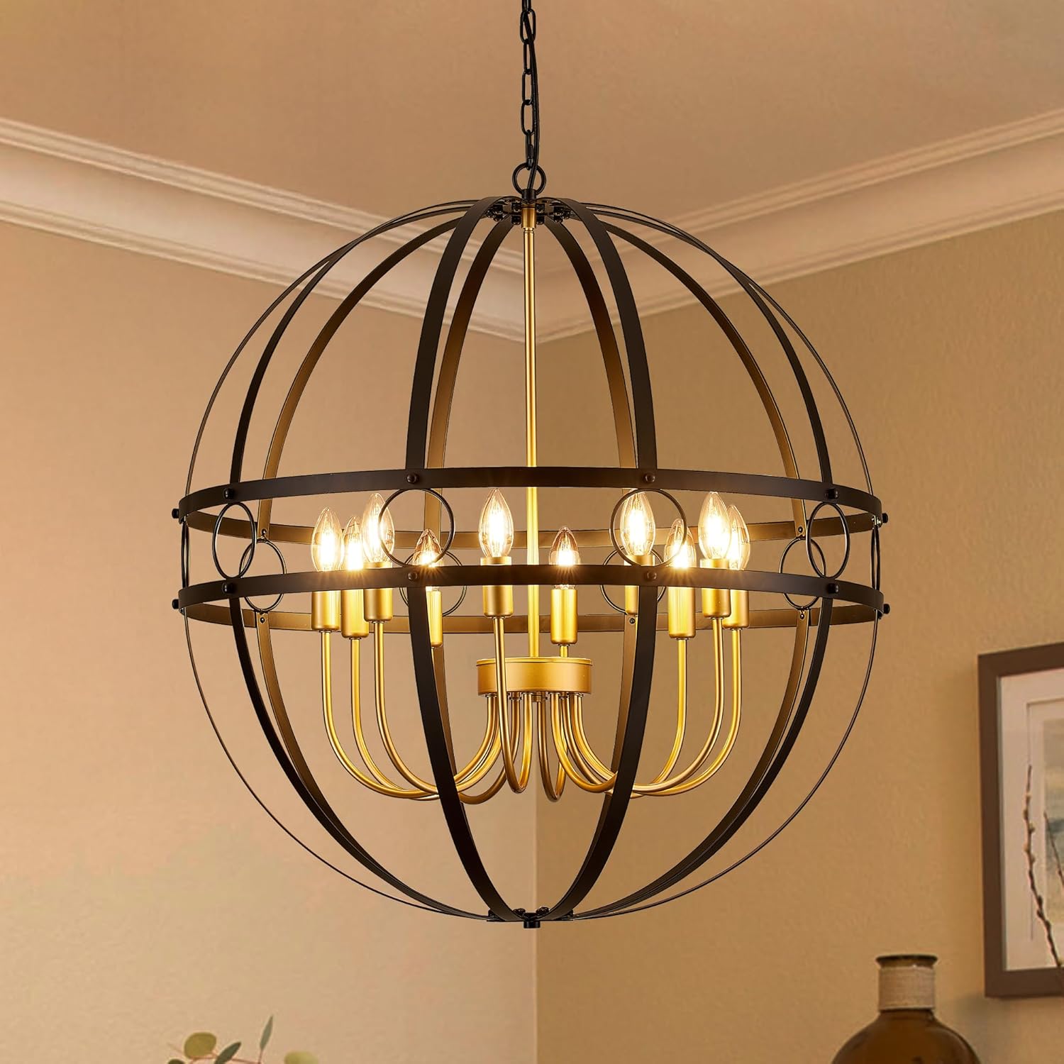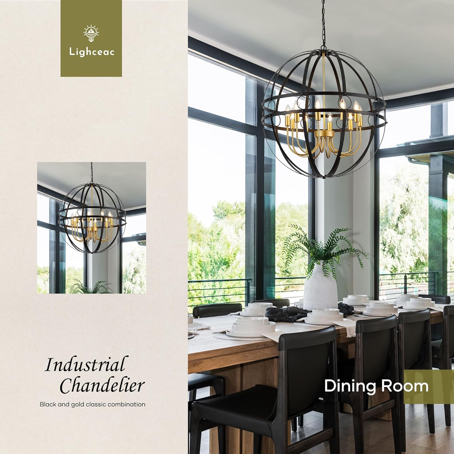 Who we are:Lighceac is a professional indoor lighting fixtures manufacturer. To produce a wide variety of high-quality products, we have advanced facilities and a professional designer team.Main products:Modern Pendant Lights, Wall Lights, Ceiling Lights, Chandeliers, and Island Lights, etc.Product Specification:Style: Industrial Black and Gold Globe ChandelierMaterial: MetalFinish: PaintedDimension: D22.8’’ X H25.2’’Bulb Base: 8*E12 Bases (Bulb not included)Voltage: 110V Maximum Wattage: 40W Per BulbSuggested room fit: kitchen island, dining room, bedroom, foyer, hallway, stairway and entryway, and more.Package Included:1x Globe Chandelier1x User manual1x Accessories package⚠Warm Tips:● Please make sure you have cut off the electricity supply before installation.● Do not exceed specified wattage.● Avoid using harsh chemicals and abrasives as they may damage the finish.● If you have any problem with installation, please feel free to contact us, we will reply to you in 24 hours.
