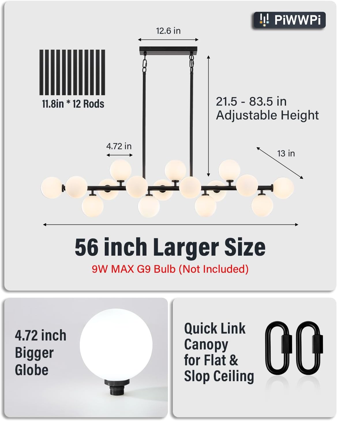 | Included Components | 1 * Globe Sputnik Chandelier, 16 * 4.72" Milk White Globe Shades, Bulb, Instruction Manual, Mounting Hardware |