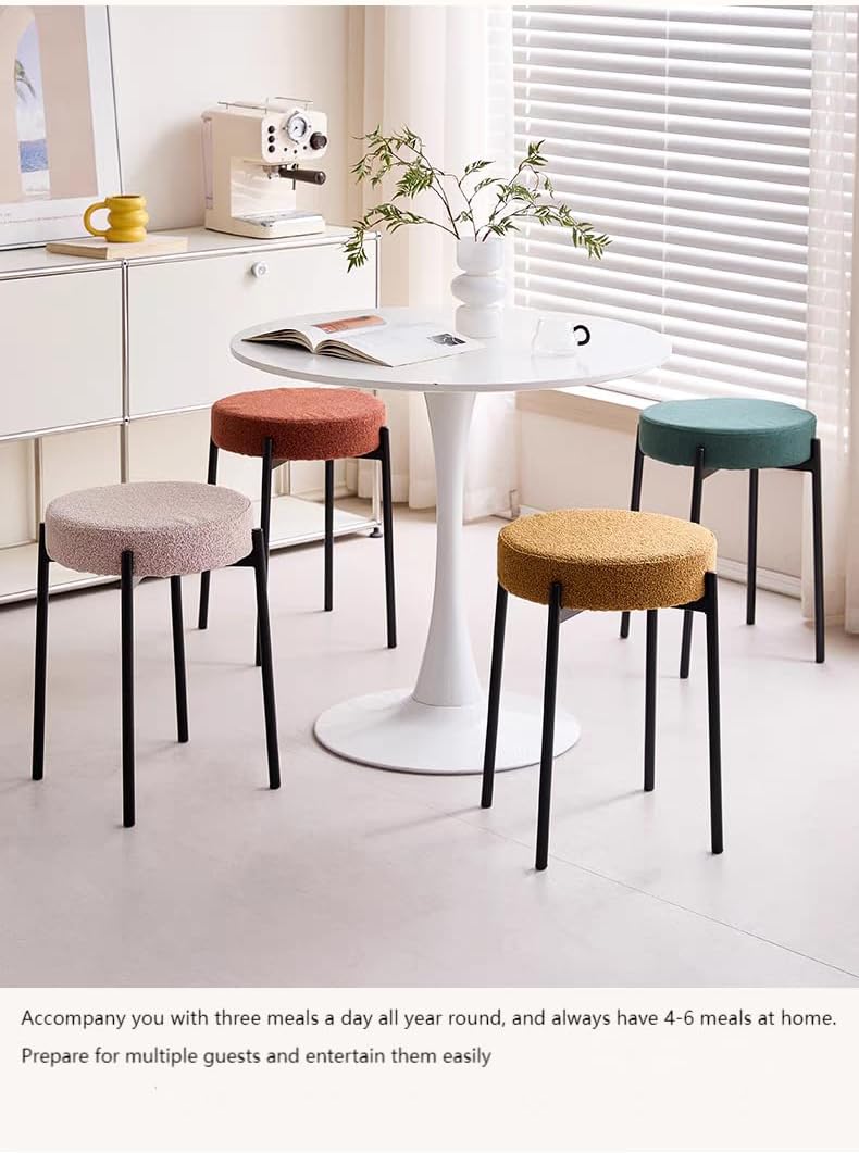 Transform your space with these modern stackable round stools that blend style and functionality. Each set includes 4 distinctively colored stools featuring plush cushioned seats in earthy tones of terracotta, forest green, mustard, and light gray. The sleek black metal frame provides sturdy support while maintaining a minimalist aesthetic. These versatile stools are perfect for both residential and commercial settings, offering comfortable seating around dining tables or as flexible extra seating options. The thoughtfully designed thick cushioning ensures lasting comfort, while the stackable feature makes storage effortless when not in use. The round seats and slim metal legs create an elegant silhouette that complements contemporary interiors. These space-saving stools are ideal for apartments, cafes, or any setting where style meets practicality. The durable construction combines the strength of metal frames with comfortable upholstered seats, making them suitable for daily use. When unexpected guests arrive, simply unstack these fashionable stools for instant seating solutions.