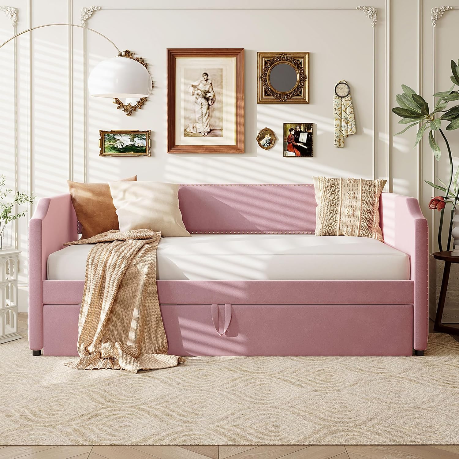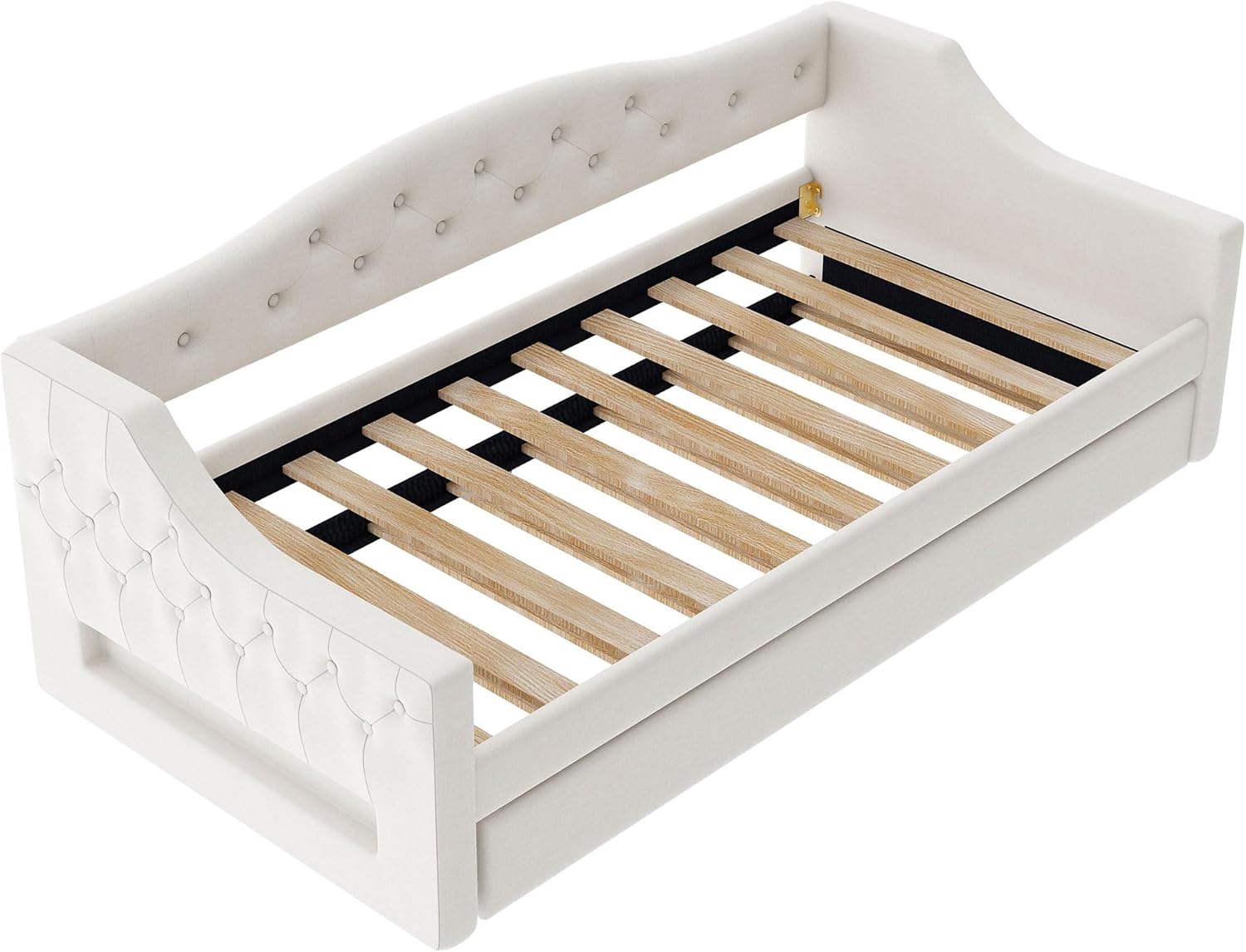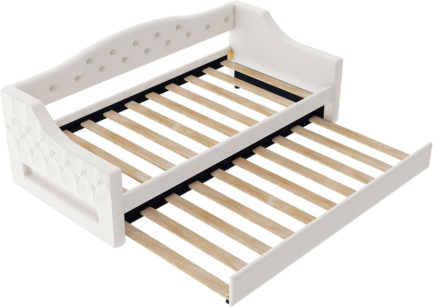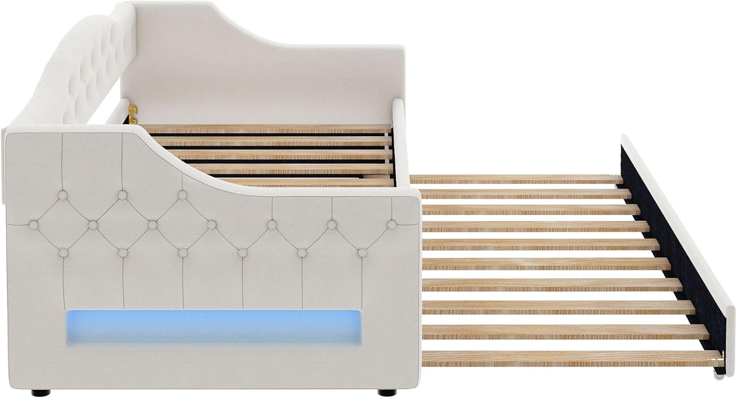 💕This platform bed frame comes with linen cover backrest and is designed with a clean silhouette and a hue of elegance. It suits all styles of home decoration, and completes the look of any bedroom. The design of the trundle is enough to accommodate your friends or any overnight sleepers. 💕Description: Material:Linen + MDF Size:Twin XL Color:Gray Numbers of Package:2 Spring Box:No need Assembly Required:Yes Origin:Viet Nam 💕Dimensions: Overall Product Dimension:84''L x 41.5''W x 27''H Twin Xl Bed:80.5'' x 39.5'' Total Height:27'' Number of Bed Slats(Upper/Trundle):10pcs/10pcs Recommend Mattress:Thickness of Bed(Upper/Trundle) 6'' Overall Product Weight:99lbs Bed Weight Capacity(Upper/Trundle):250lb