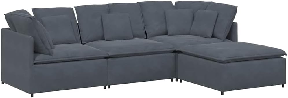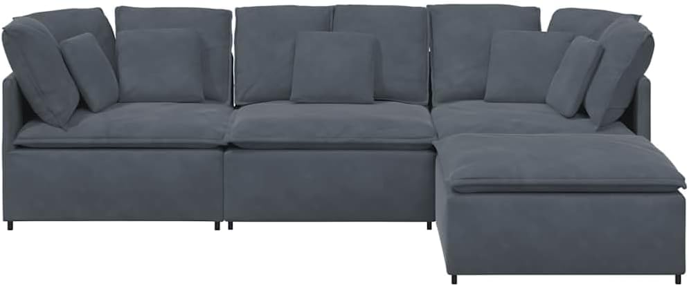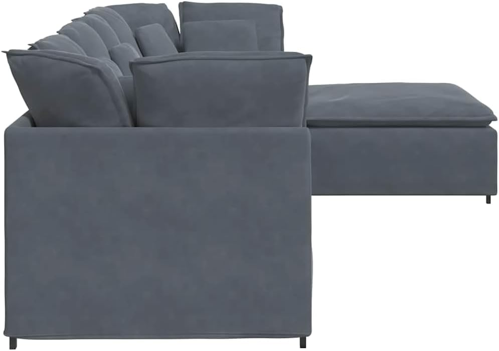 This modular sectional sofa nails the balance of style and functionality, made for your comfort with space for up to five. Its sleek dark gray velvet and modern design make it a standout in your living room, perfect for chilling with family and friends.Versatile Configuration: The modular design lets you set it up in loads of ways, fitting various spaces. Easily change the sofa into an L-shape or straight, depending on what you need.Plush Velvet Material: Made from soft velvet fabric, the cushions give you a luxe feel, perfect for long movie marathons or chill sessions.Extensive Cushioning: This sofa comes with loads of cushions in different sizes, ready to support you in style, whether you're lounging or hosting.Sturdy Frame Construction: Built with a tough metal and wood frame, this sectional's ready for the long haul, ensuring comfort and style for ages.Easy Maintenance: The removable cushions with zip closures make cleaning a breeze, so you can keep your sofa looking fresh without the hassle.Colour: Dim Grey Material: Farbic VelvetFinish: Matte Indoor/Outdoor: Indoor OnlyCover Included: NoRoom: Living RoomCapacity: Seats plentyMaximum Number of People: 5Dimensions: 200 x 300 x 64 cm (W x L x H)Surface Height: 64 cmLeg Height: 10 cmSeat Depth: 100 cmSeating Capacity: 5Swings: NoDelivery Contains: 1 x Center sofa, 2 x Corner sofa, 1 x Footstool, 4 x Seat cushion, 8 x Large cushion, 5 x Small cushion, Assembly accessoriesAssembly Required: YesRecommended Number of People for Assembly: 2SKU: 3321310