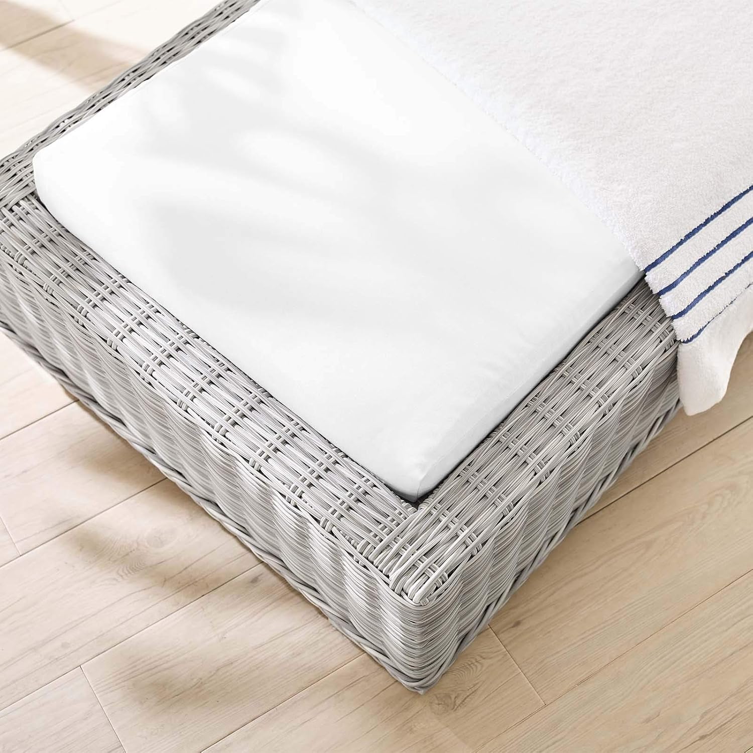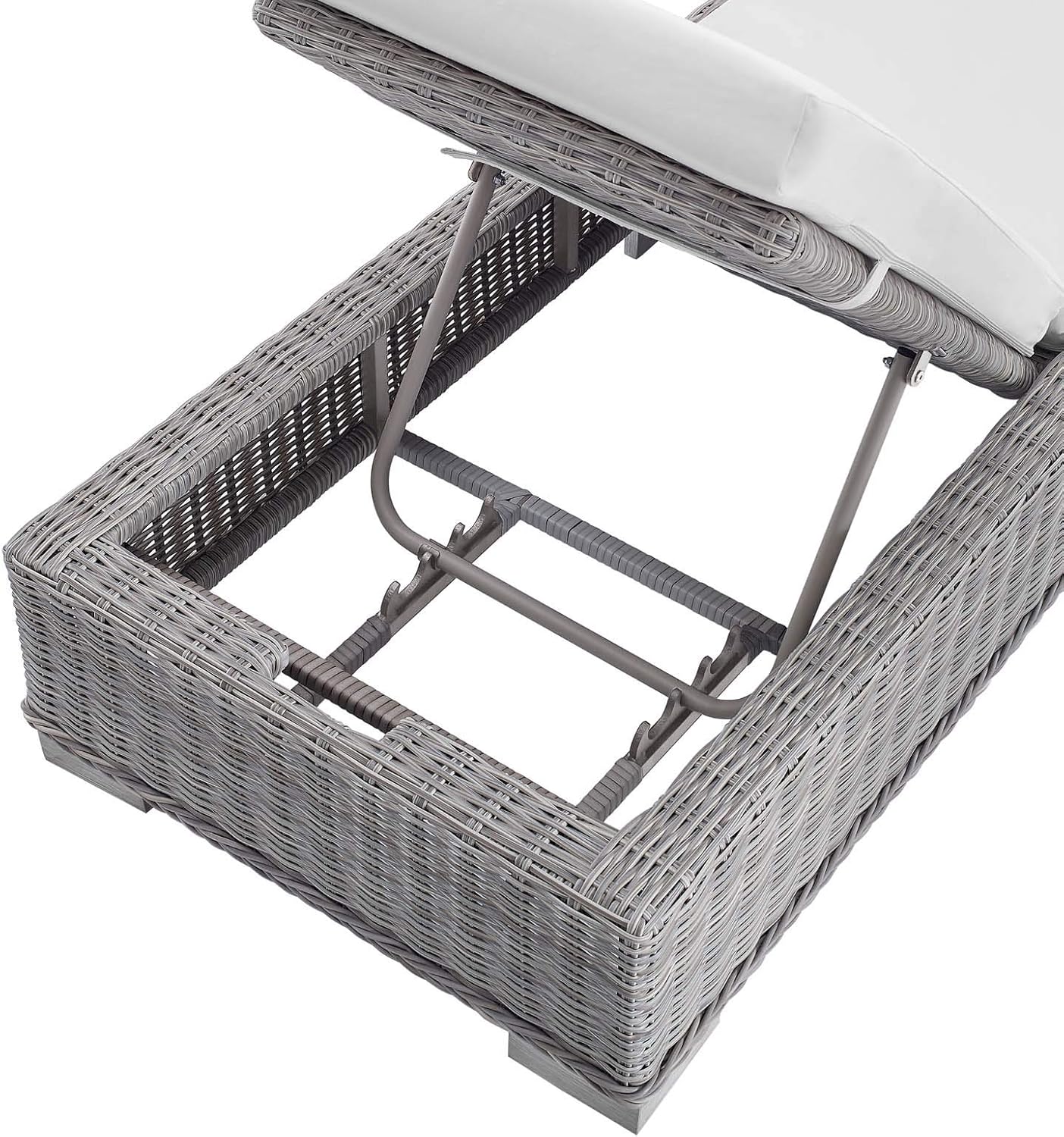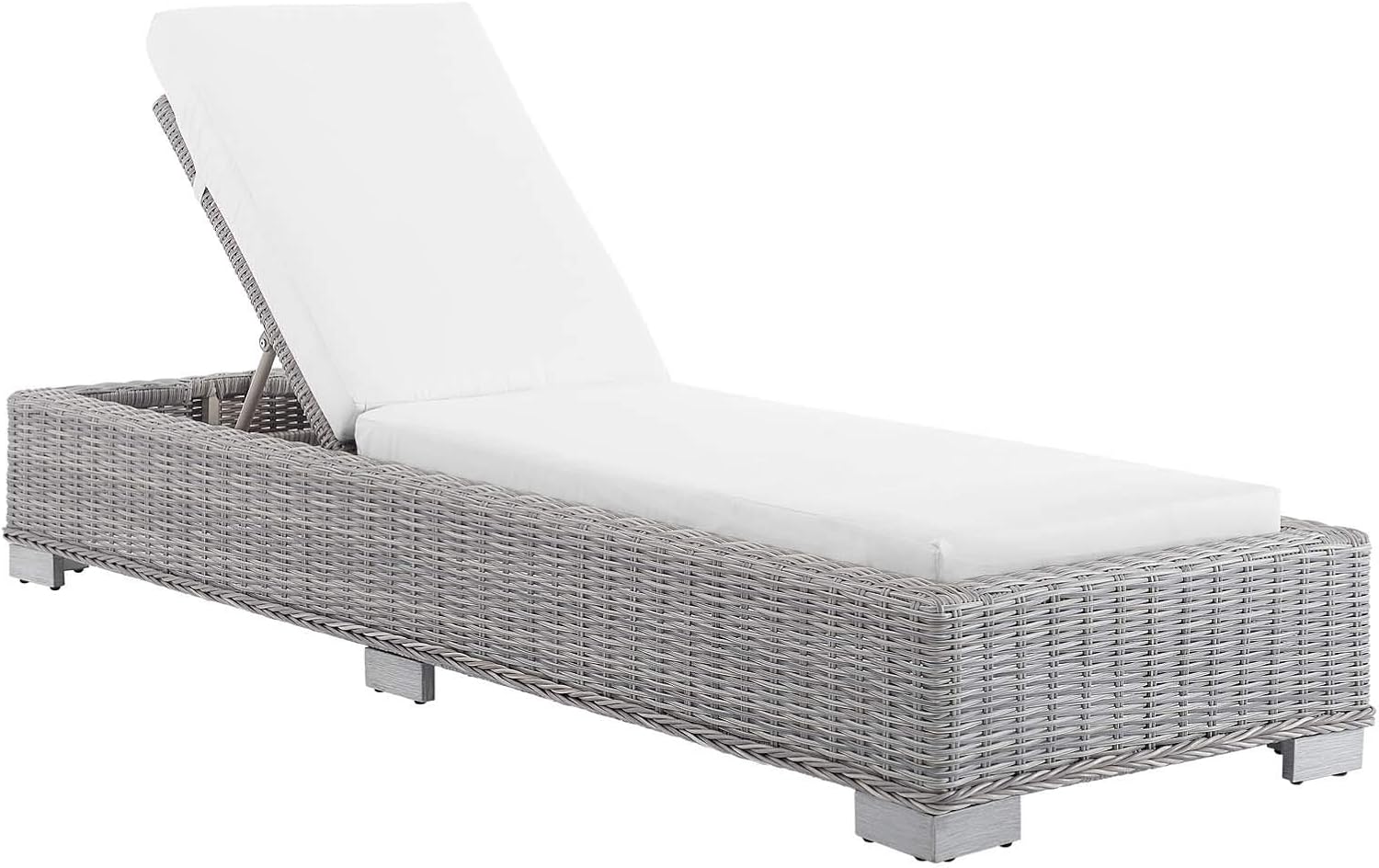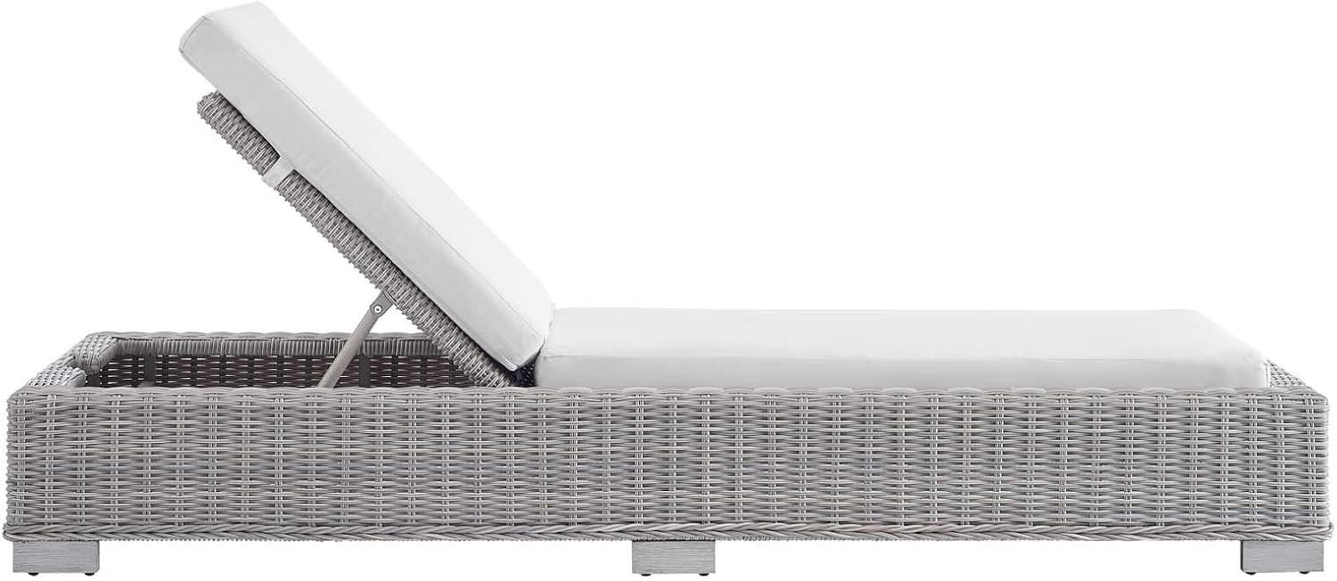 Enjoy fresh air and alfresco relaxation with the Conway Outdoor Patio Wicker Rattan Chaise Lounge Chair. Wrapped in UV-resistant light gray synthetic wicker rattan, this lounge chair boasts organic texture and a neutral hue that brings a calming presence to your outdoor space. With four different recline positions, the frame of this outdoor chaise lounge is crafted with durable powder-coated aluminum and rests on L-shaped legs with plastic foot glides. Thick foam padded cushions covered with washable water-resistant Sunbrella® fabric covers offer a comfortable seat and affix securely to the lounge chair with cord tension attachments. Trending aesthetics and a classic design define this outdoor patio furniture collection making it a beautiful addition to any outdoor space including the backyard, patio, porch, balcony, or poolside. Assembly required. Chaise Lounge Weight Capacity: 600 lbs.