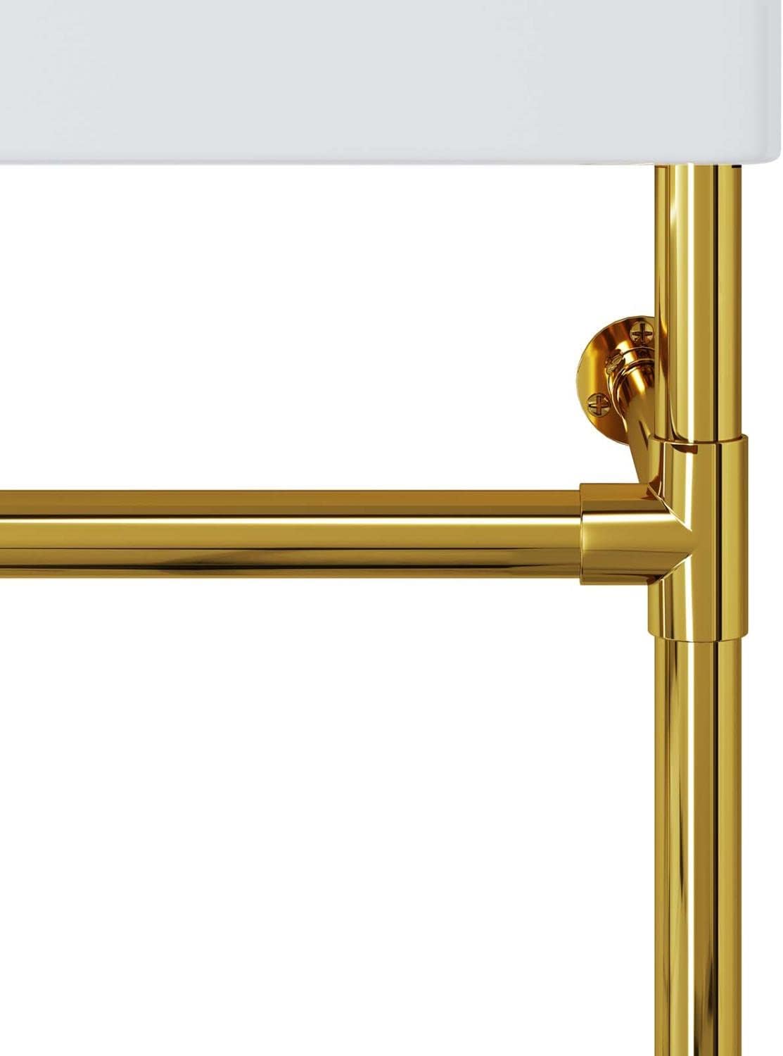Create a bathroom oasis with the minimalist style and efficiency of the Redeem brushed gold wall-mount stainless steel bathroom vanity. The glossy white ceramic basin and robust steel frame affix directly and securely to the bathroom or powder room wall. Redeem dispenses gentility in spaces large and small, resting confidently on a brushed gold stainless steel frame with matching gold brackets for added stability. This small bathroom vanity has a single faucet hole and is outfitted with non-marking foot caps to protect your bathroom floor. Assembly required and fixtures not included.Features:- Materials: Ceramic, stainless steel- Finish: Gold/White- Set Includes: One (1) Redeem 24"Wall-mount gold stainless steel bathroom vanity- KD structure- Ceramic top- ACR: Acrylic rod frame- Stainless steel frame in gold color- Contemporary bathroom vanity- Brushed gold stainless steel frame- Ceramic sink basin- Wall-mount- Single faucet hole- Non-marking foot capsSpecifications:- Product Dimensions: (Overall) 33.5"H x 18"W x 23.5"D ; (Top) 6"H x 18"W x 23.5"D ; (Base) 27.5"H x 17"W x 22.5"D- Product Weight: 55 lbs