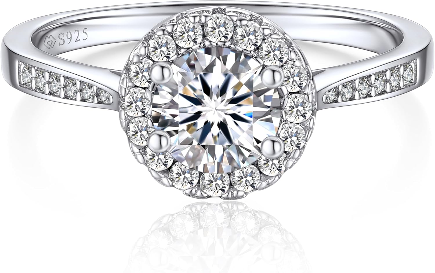 Specification: Style: Halo engegement ring Stone Type: Moissanite Total Gem: 6.5mm/1 carat main stone+ 0.33 carat accents (1.5mm*16pieces-Halo base + 1.5mm*10 pieces + 1mm*2 pieces-shank), total 1.33 carats Gem Cut: Brillant Round Cut Gem Color: D Gem Clarity: VVS1 Gem Setting: 4 Prong Setting Metal: S925 Sterling silver Total Weight:2.7g Minmum age: 16+ years old Perfect Birthday Gifts for Women:This round solitaire ring packed with a delicate box as an perfect gift for birthday gift, valentine's day gift, Mother’s day gift, engagement, promise, holiday Christmas. Gifts for women, gifts for mom, gifts for mother in law, gifts for wife.Suitable Age: over 16 years old