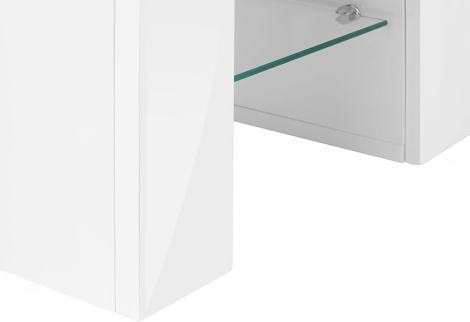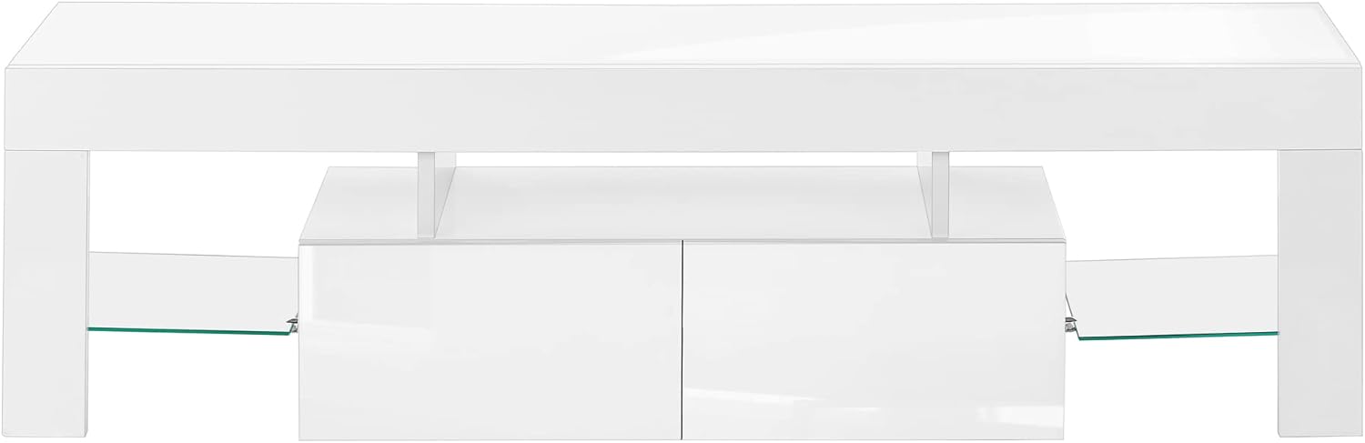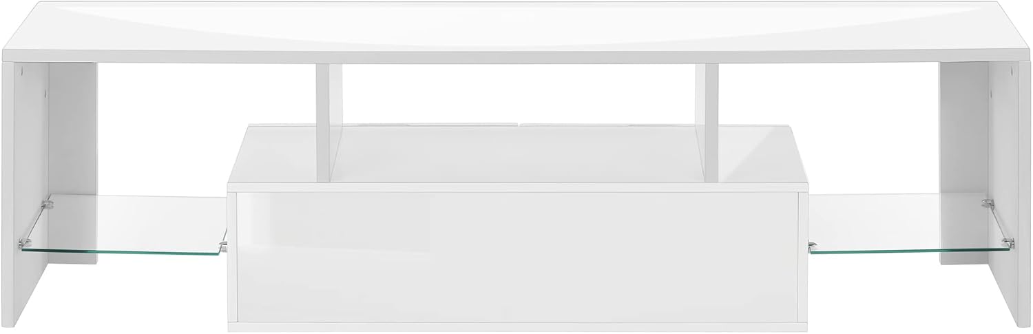 Add that wow factor to your contemporary living room or bedroom space with this sophisticated tv stand finished in glossy white laminate. This entertainment center features thick paneled fixed shelves to accommodate all your media components, 2 integrated storage drawers, and accented with 8 mm clear tempered glass shelving giving it that modern airy appeal. This style worthy tv stand can accommodate all TV sizes with a center stand. Assembly is required.