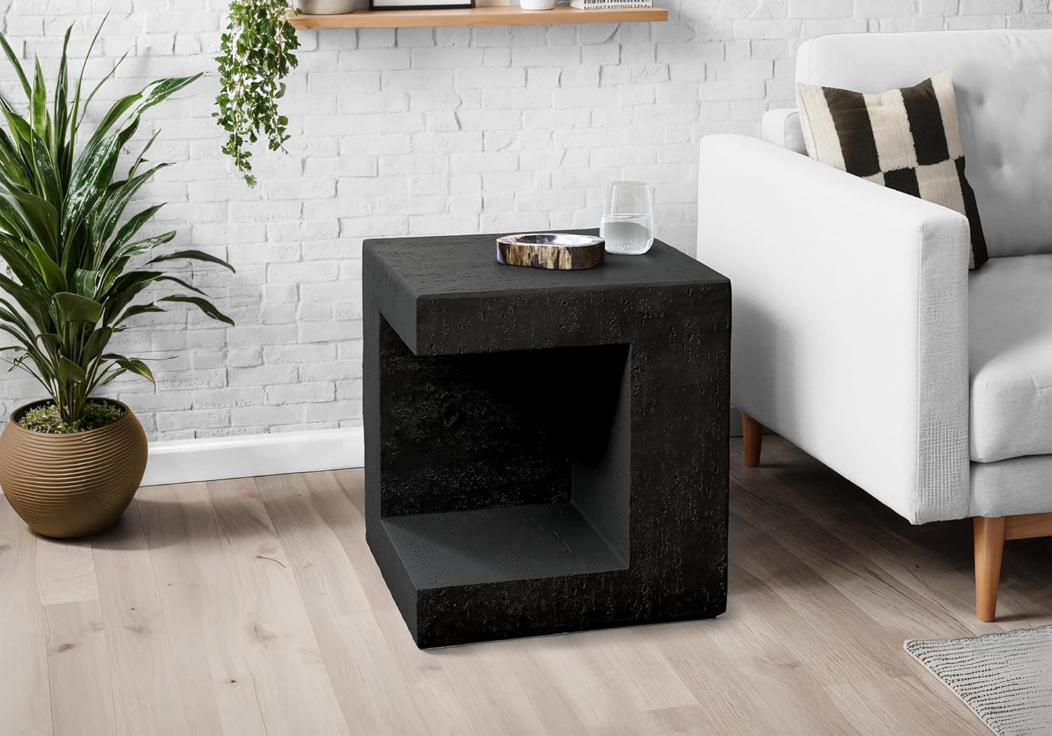 Enhance your home decor with our stunning 25"h accent table, perfectly combining practicality with fashionable style. This modern indoor/outdoor side table boasts a concrete-look black finish, making it the ideal addition for a contemporary bedroom, living room, or outdoor patio. Crafted with durably designed magnesium oxide material for weather resistance, this chic square shaped table is built to last and comes with a 5 year limited warranty against manufacturer defects for your peace of mind. Its space-saving design with a unique cut-out feature reveals an open shelf for display or storage, fitting effortlessly in any indoor or outdoor space. The easy to clean top is a practical solution for interior and exterior rooms, allowing you to maintain that fresh, contemporary look without the fuss. Use it as a stylish nightstand by your bed or as an end table next to your favorite patio chair or living room sofa its versatility knows no bounds! Add a touch of elegance to your indoor or outdoor spaces with this cube accent table, a quintessential piece for the trendiest customers.