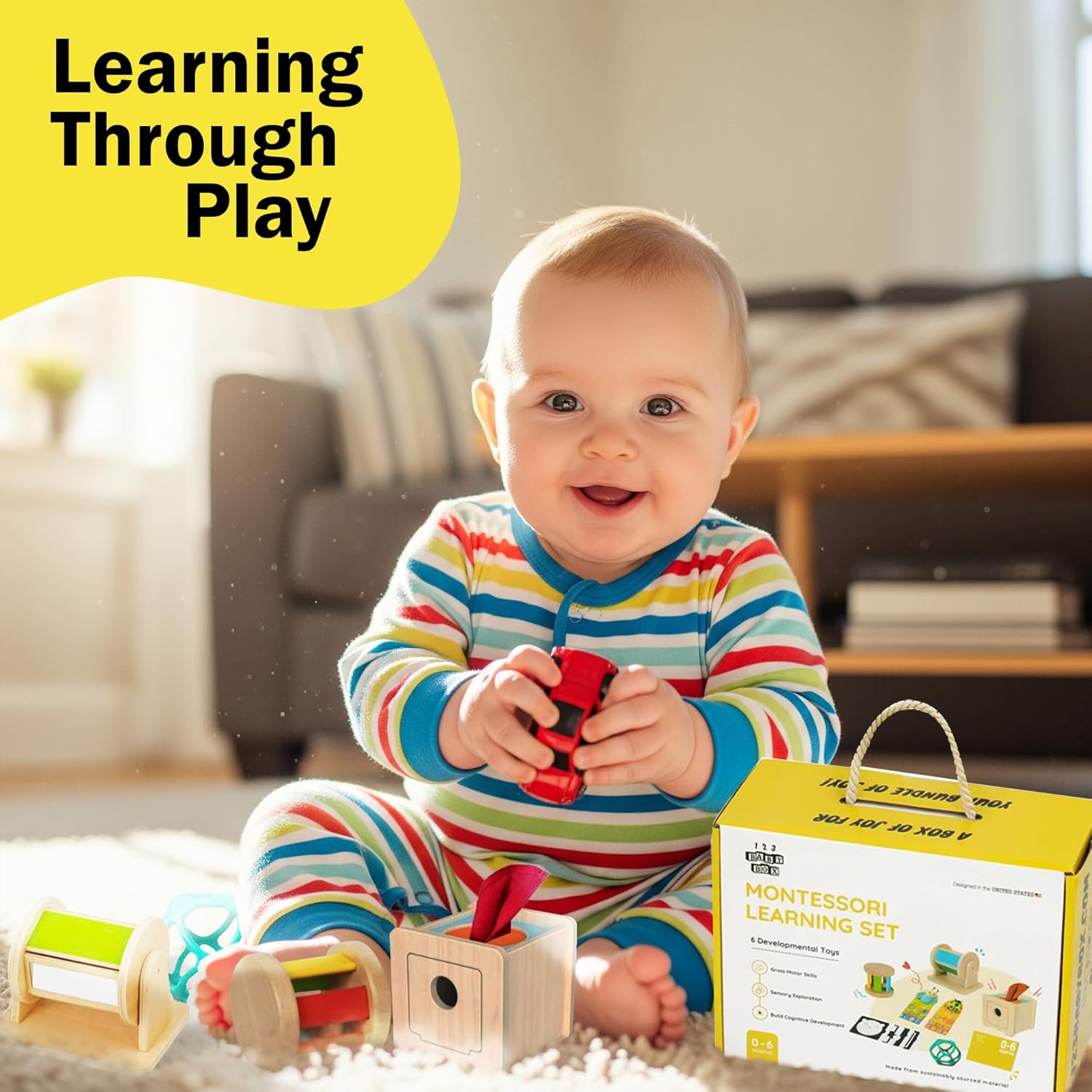 Introduce your little one to the world of learning with this comprehensive 123 BABY BOX 6-in-1 Montessori Learning Set, perfectly designed for babies aged 0-6 months. This thoughtfully curated collection includes a Rolling Bell for sensory development, a Magic Tissue Box for cause-and-effect learning, a Spinning Drum for visual tracking, a Gripping Ball Teether for tactile exploration, engaging Rattle Socks, and Black and White Cards for early visual stimulation. Each component strengthens fine motor skills, enhances perception, and supports cognitive development through hands-on play. Made with high-quality materials, these age-appropriate toys encourage natural discovery and learning. The set features manual operation without batteries, making it ideal for sustained engagement. Measuring 12.8” L x 5.51” W x 10.63” H inches and weighing 4.22 pounds, this collection provides a perfect balance of educational value and entertainment. Watch as your baby develops essential skills like reasoning, social interaction, and logical thinking through joyful exploration. The unisex design makes it an excellent choice for all infants, providing hours of developmental play and learning opportunities.