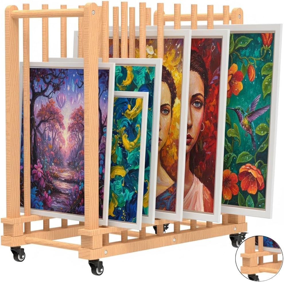 Extra-Large Art Storage Rack with Wheels — Adjustable Wooden Drying & Display Rack for Canvas, Prints & Artwork Organize, protect, and display your artwork like a pro with this Extra-Large Art Storage Rack with Wheels. Perfect for artists, art teachers, galleries, and studios, this multi-tier wooden art drying rack provides exceptional storage capacity for canvases, panels, paintings, watercolor boards, and framed prints. Built from durable natural wood and equipped with smooth-rolling caster wheels, it’s ideal for classrooms, art studios, and gallery storage where mobility, safety, and convenience matter most. Key FeaturesExtra-Large Art Storage Capacity: This heavy-duty art drying rack features multiple angled slots that can hold large canvases, wet paintings, art boards, and prints safely and securely.Adjustable & Versatile Design: Adjustable dividers and angled shelving allow for customized spacing — perfect for different canvas thicknesses and sizes.Durable Wooden Frame: Made from premium natural wood for long-lasting performance in art studios, classrooms, and gallery settings.360° Swivel Wheels with Locking Brakes: Move the art storage rack effortlessly around your studio, and lock it in place for stable use while drying or displaying artwork.Protects Your Artwork: Smooth wooden surfaces prevent scratching and damage to edges and surfaces, while open air design promotes fast drying and ventilation.Multi-Purpose Use: Ideal for painters, art students, schools, museums, printmakers, and photographers — a must-have art organizer for any creative space.Product SpecificationsMaterial High-quality solid wood with reinforced joints and smooth finish Finish Natural wood (eco-friendly varnish, easy to clean) Overall Size (approx.) Extra-large rack fits a wide range of canvas and panel sizes (see detailed dimensions in product image) Slots Adjustable angled slots for drying, storing, or displaying multiple artworks simultaneously Casters 4 heavy-duty swivel caster wheels (2 with brakes for secure positioning) Assembly Easy assembly with included hardware and illustrated instructions Why Artists Love It This adjustable art drying rack with wheels is a studio essential for managing multiple projects without clutter. Whether you're storing oil paintings, acrylic canvases, watercolor paper, or digital prints, the multi-tier design saves space and keeps your artwork protected. Its smooth-rolling casters make it easy to move between drying areas, display walls, or classrooms. Perfect ForArt classrooms & school art departmentsProfessional art studios & galleriesHome artists and hobby paintersPrintmakers and photography studiosCare & MaintenanceWipe clean with a soft, dry cloth; avoid prolonged moisture exposure.Check and tighten screws periodically for stability.Lock wheels when stationary for safety and precision drying. Bring organization and mobility to your creative workspace with the Extra-Large Adjustable Art Storage Rack with Wheels — the perfect combination of durability, flexibility, and modern studio design. Click Add to Cart now and upgrade your art studio storage solution today!