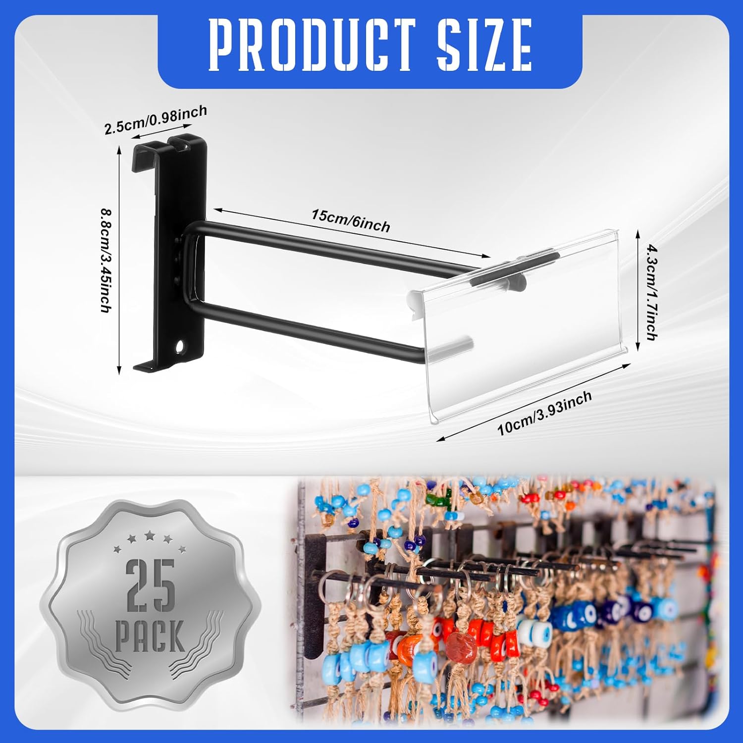 Features: Innovatively combines grid hooks with label holders for organized display. Securely attaches to grid walls. Simply slide price tags into holders and hang items, adaptable to your specific layout. Specifications: Material: iron Color: black Size: about 6 inch Package includes: 25 x Double rod hooks 25 x Label card holders Notes: Manual measurement, please allow slight errors on size. The color may exist a slight difference due to different screen displays.