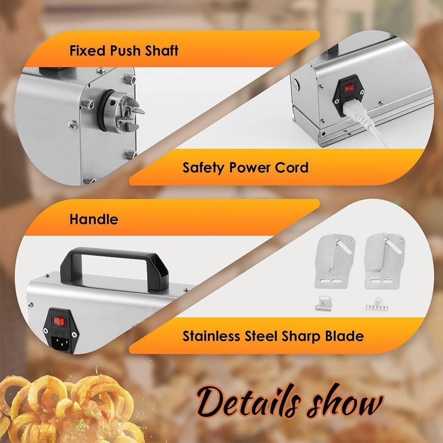 Power: 40WVoltage: 110~220V/5060HzSpeed: 180 R/minMaterial: All stainless steelOperation mode: Semi-automaticMachine size: 34.5*13*8.5 cmBox size: 41.6*15*19 cmNet weight: 3.2kgGross weight: 4 kgPacking list: 1 * Electric Tornado Potato Slicer