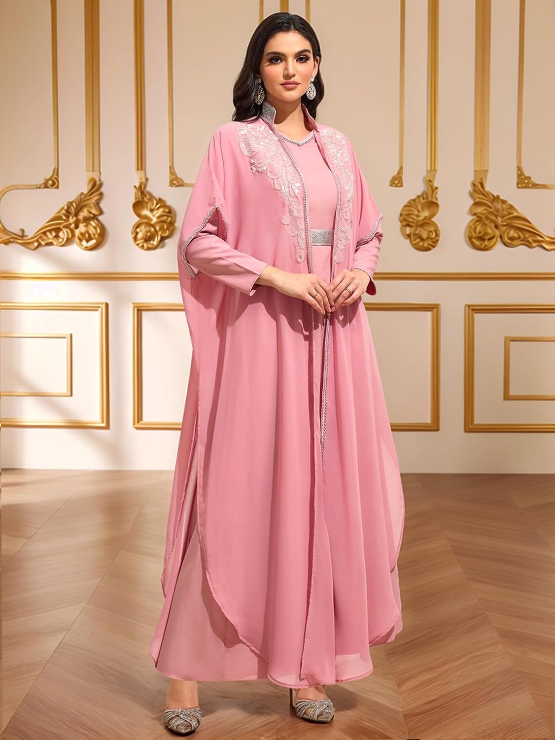 This Muslim abaya dress offers an elegant blend of traditional modesty and contemporary style, featuring intricate embroidered and sequin details with a flowing chiffon silhouette. The dress is fully hijab-friendly, providing complete modest coverage while maintaining a fashionable appearance. Constructed from lightweight, breathable chiffon fabric, it drapes beautifully and feels soft against the skin. The high-quality stitching ensures durability, resistance to fraying and snags, while the wrinkle-resistant material simplifies care and maintenance. The design includes an adjustable belted waist that allows for a flattering silhouette, paired with a long maxi length that adheres to Islamic clothing standards. Available in sizes S through 2XL, the loose, flowy cut accommodates various body types while ensuring unrestricted movement and comfort. Choose from three sophisticated color options: classic black adorned with gold sequins, rich burgundy featuring gold floral embroidery, or soft pink accented with silver lace detailing. The exquisite embellishments add a luxurious touch, making this versatile abaya suitable for Ramadan celebrations, Eid festivities, formal weddings, prayer sessions, and everyday wear. The breathable fabric performs well in both warm and cool conditions, ensuring all-day comfort for any occasion.
