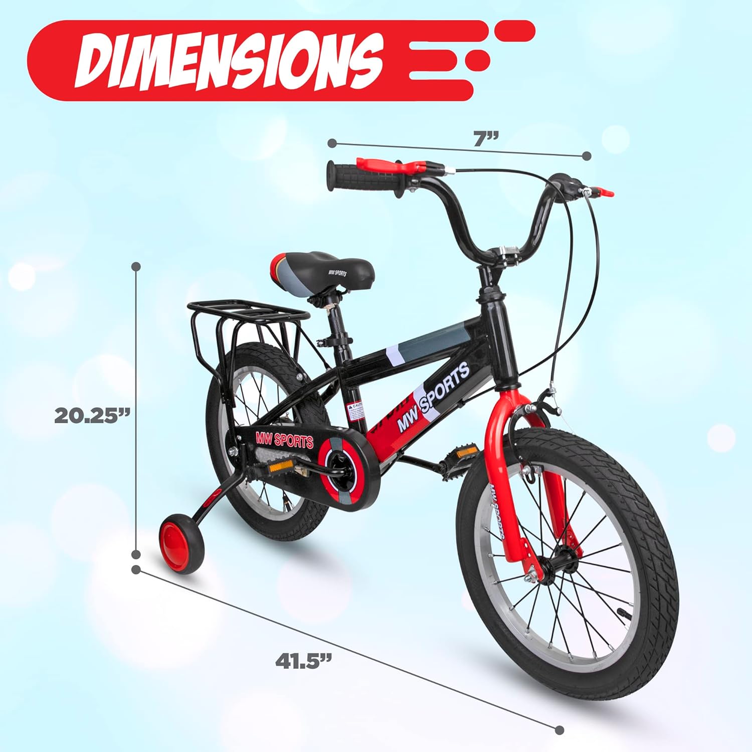 MW Sports boys bikes are designed with little boys in mind. Sporty design with a back relay rack meant to store/strap extra "stuff". Features an adjustable seat with quick release latch for preferred height. Front and back hand brakes for a safe ride and the handlebars are easy for little hands to use. Solid and sturdy steel frame with a low stand-over height will make your young rider first bike experience comfortable and confidence inspiring. Making MW Sports the ulitmate bike for kids.
