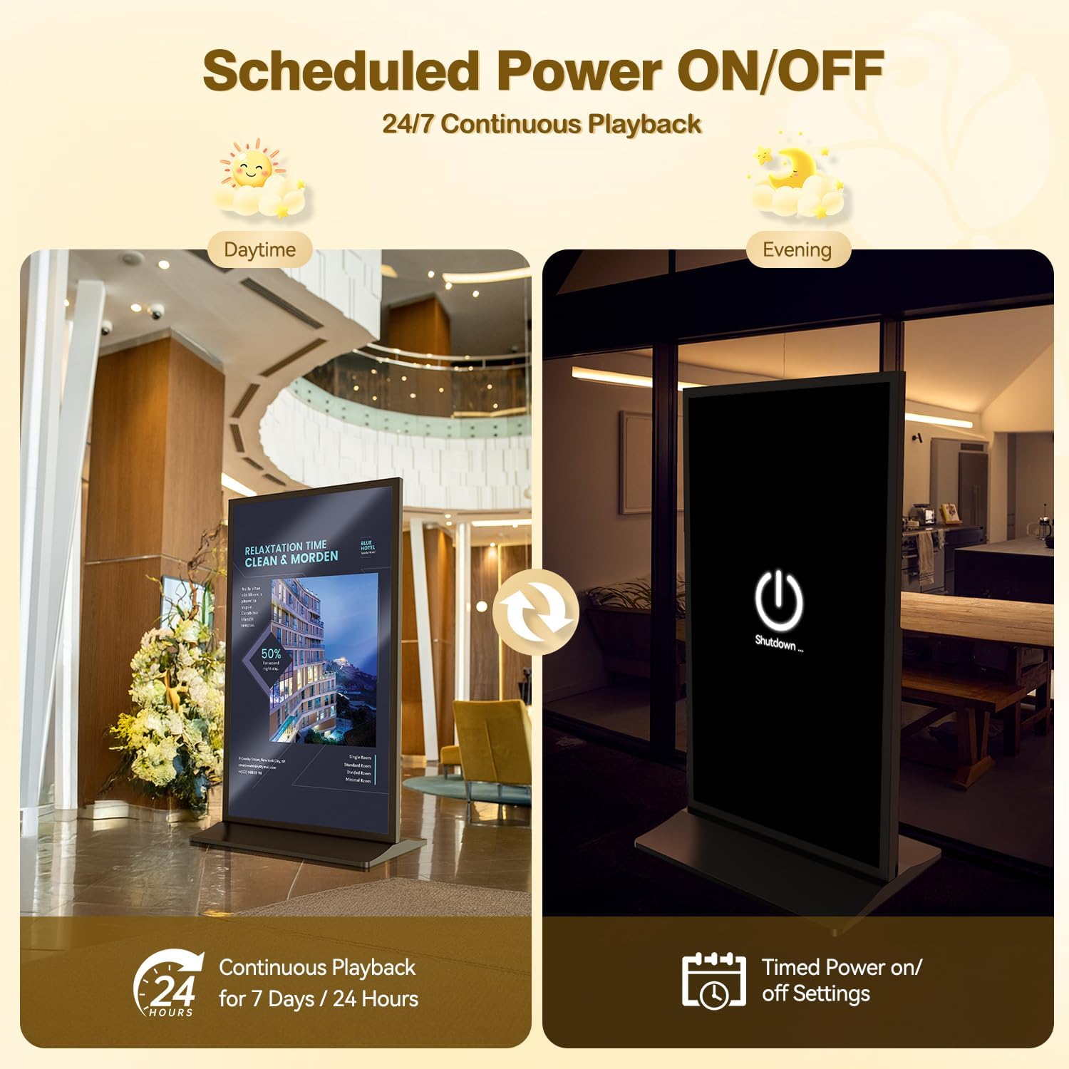 • 【Energy-Saving Timer for Automated Operation】Set daily on/off schedules with the built-in timer function to match your business hours. The MWE-QIXZOCV display can automatically wake up and shut down, reducing power consumption and extending screen lifespan. Ideal for locations like cafeterias, hotels, or shops with fixed operating times—this smart feature ensures your signage works only when needed, saving costs while maintaining reliability.