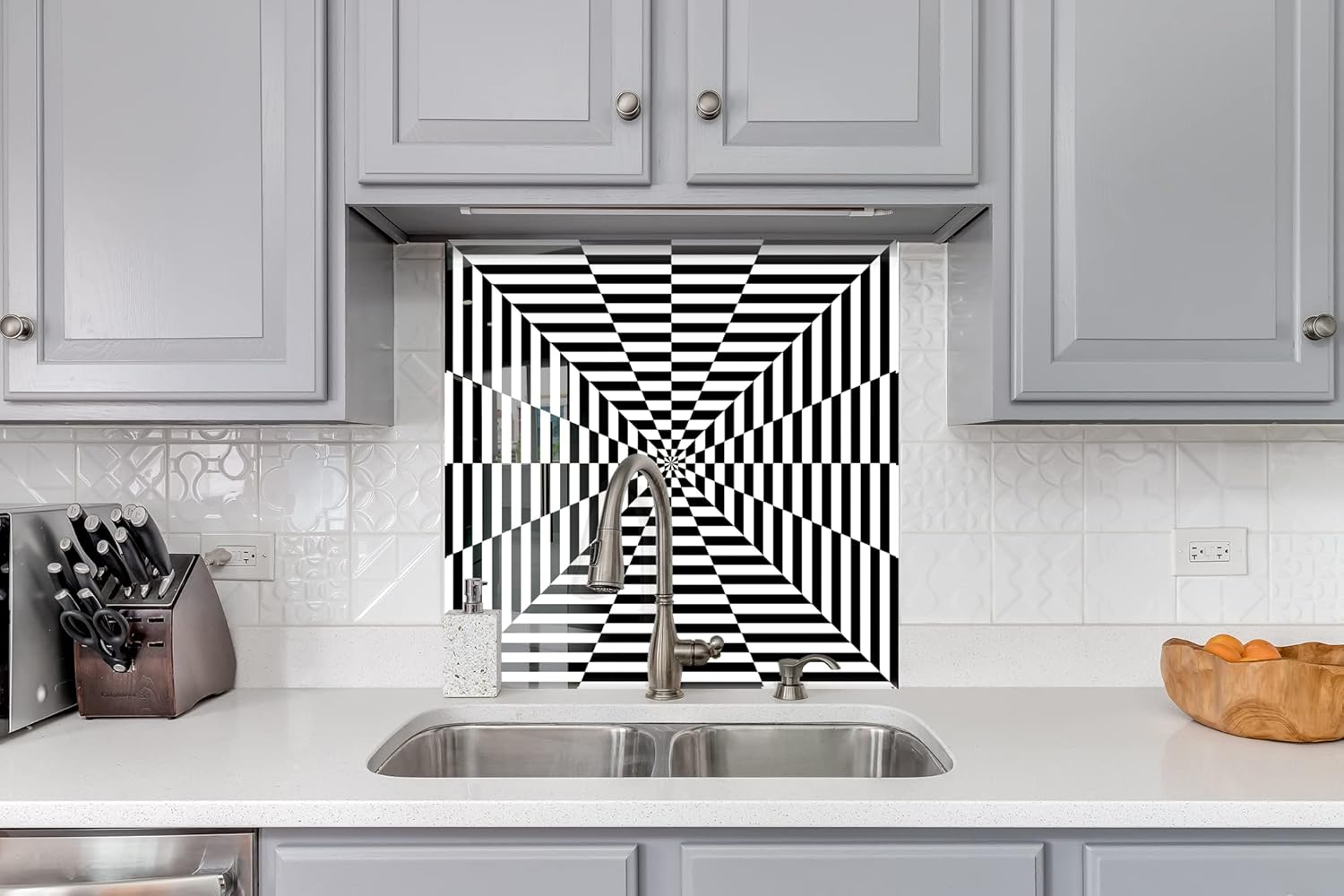 Myphotostation Black and White Tempered Glass Backsplash 16x16'' Geometric Splashback for Kitchen Decor Bathroom Wall Protector Oven Backsplash Panel Tile Glass Stove Splashback Kitchen Decor