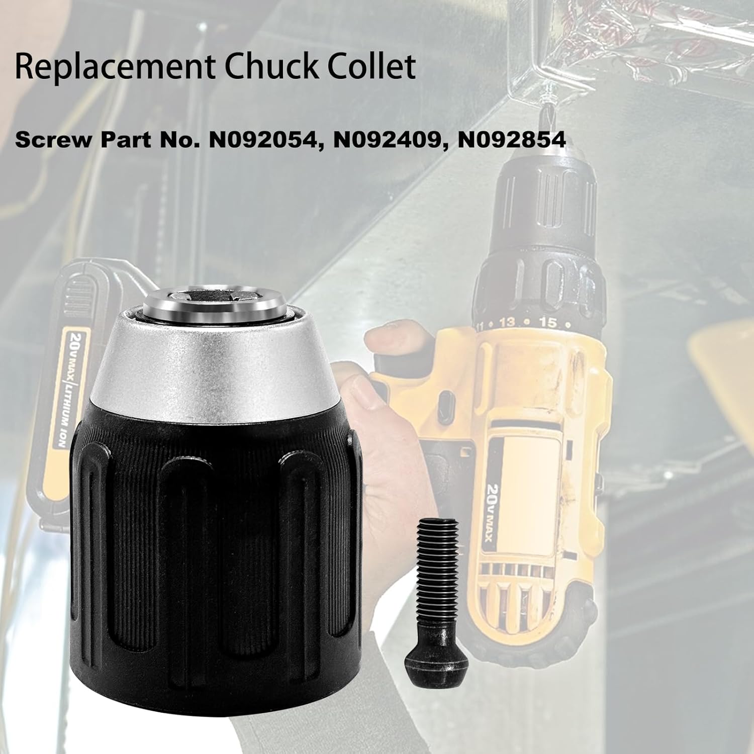 Replacement Drill Chuck part number: N092054, N092409, N092854; Package Includes: 1 x Drill Chuck Keyless and 1 x Chuck Screw. Chuck Keyless N092054 Fits for DeWALT DCD771C2 DCD785C2 DCD780B DCD775B DCD760B DC970K DC970K-2 DC759KA DC725K-2 DC725B DCD735 Cordless Drill N092409 Keyless chuck Fits for DeWALT DCD780L2, DCD785, DCD785C2, DCD785L, DCD785X, DCK759, DW959K2, DCD780B, DCD780, DCD775KL, DCD775B, DCD771, DCD771C2, DCD770KL, DCD760B, DCD735, DCD735L, DCD730, DCD730L, DCD730, DC970K, DC970K-2, DC759KA, DC756KA, DC743KA, DC730KA, DC728KA, DC725VA, DC725K-2, DC725B, DC720KA, DCD730M2 Cordless Drill Chuck Keyless N092409 Fits for Black & decker DCD730 (TYPE 1), DCD730 (TYPE 10), DCD730L (TYPE 1), DCD780 (TYPE 1), DCD780 (TYPE 10), DCD780L2 (TYPE 1), DCD785 (TYPE 1), DCD785 (TYPE 10), DCD785L (TYPE 1) Cordless Drill N092054 Router Collet Fits for DeWALT DCD785C2 Type 1 18v Hammer Drill, DCD780C2 Type 1 18V Drill/Driver, DCD780C2-B2 Type 1 20V Compact Drill/Driver, DCD785C2-B2 Type 1 20V Max Compact Hammer Drill, DCD780B (Type 1) 20V Drill/Driver, DCD780B (Type 3) 20V Drill/Driver, DCD780B (Type 2) 20v Drill/Driver Power Tool, DCD780B (Type 4) 20v Drill/Driver Power Tool, DCD780C2-B2 (Type 2) 20v Max Compact Drill / D Power Tool.