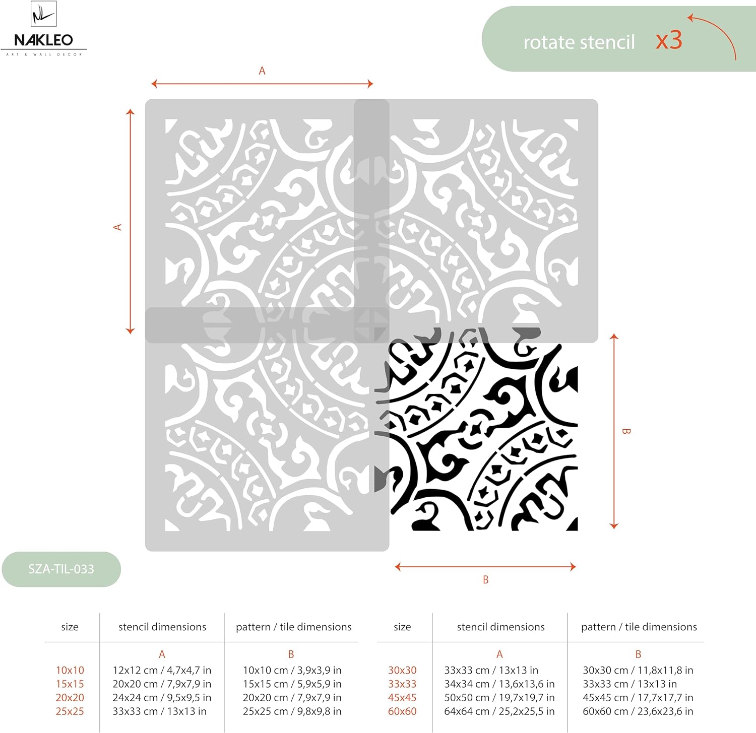 Collection Nakleo Tile Stencils is a series of painting stencils that imitate patterns found on ceramic tiles. Concrete stencils are made of strong, flexible and durable plastic - they can be used repeatedly to easily cover even the large surfaces at a low cost. With patio stencil patterns available in eight sizes, from 3,9”x3,9” to 23,6”x23,6”, they can be easily customized to fit most individual needs.Tile painting templates will let you create unique and unusual interiors on your own. With Nakleo floor stencils for concrete you can give new life to old bathroom tiles, kitchen tiles, balcony tiles, terrace tiles or garden slab. You can also paint walls, paving stones, concrete or wooden floors and other flat surfaces. This is much easier and cheaper than removing tiles, which always requires specialized tools, knowledge and consumes more time. The large stencils are available in eight sizes, adapted to the most popular dimensions of ceramic tiles. Motifs inspired by classic Spanish ornaments, Moroccan tradition, ethnic and Chinese patterns, geometric minimalism, modernist style, luxury or perhaps classic retro are just some of the diverse designs of this series. If you are looking for a variety of interior and decorating inspiration, just browse through our products and find your style!