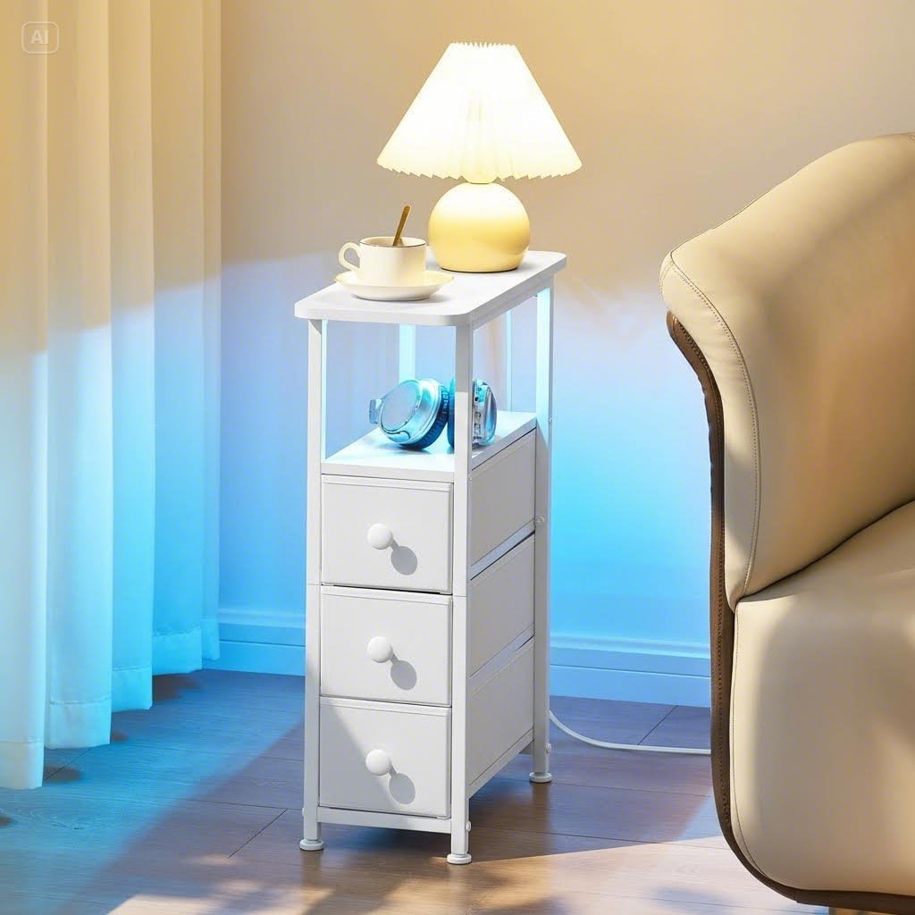 Narrow End Table with LED & with Charging Station - Space-Smart Nightstand for Small Spaces. Conquer clutter with this Narrow End Table! This narrow side table packs a 4-in-1 charging hub (2 AC outlets + 1 USB + 1 Type-C) and ambient LED lighting, perfect as a narrow nightstand or compact couch-side organizer.