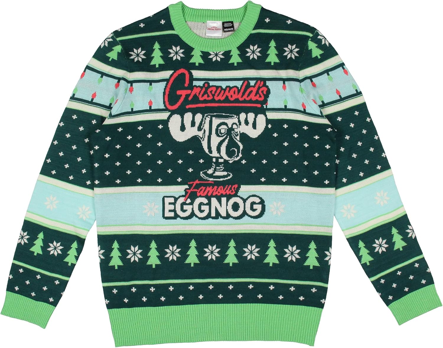 Celebrate the holiday season in style with the National Lampoon's Christmas Vacation Men's Marty Moose Eggnog Glass Cup Adult Funny Ugly Sweater for Christmas. This festive sweater features the Marty Moose Eggnog Glass, front and center, with the word "Griswold's" proudly displayed above and "Famous Eggnog" underneath, paying homage to the classic holiday movie that has become a staple in many households. The sweater is adorned with various intricate holiday-themed patterns, including pine trees and snowflakes in one section, and Christmas lights, stars, and additional snowflakes in another, creating a vibrant and cheerful design that captures the essence of the holiday season. Embracing the charm of the "Ugly Sweater for Christmas" tradition, this piece combines playful design elements with a fun, nostalgic reference to National Lampoon's Christmas Vacation, making it a great choice for holiday parties, family gatherings, or simply spreading festive cheer. Crafted from 100% acrylic,