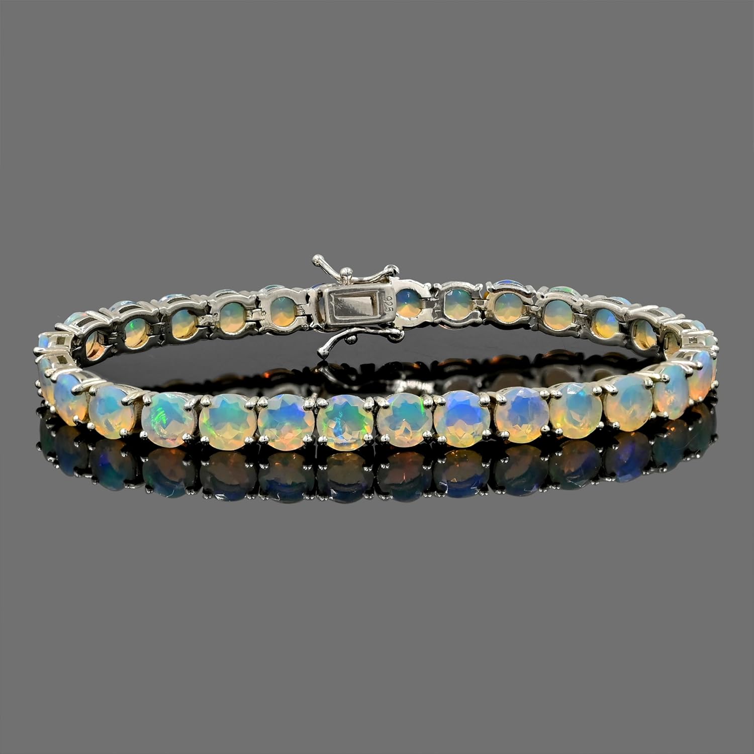 The WB-322 Natural Opal Tennis Bracelet is a timeless piece that blends elegance, color, and craftsmanship. This bracelet showcases carefully selected 6 MM round cut natural opal gemstones, known for their mesmerizing play-of-color that reflects shades of green, blue, and subtle fiery tones under light. With a total gemstone weight of approximately 11.60 carats, it offers a luxurious yet balanced appearance. Crafted in solid 925 sterling silver, the bracelet features a high-polish finish that enhances the brilliance of the opals while ensuring durability and long-lasting shine. The design is both classic and versatile, making it suitable for daily wear as well as special occasions. The bracelet is available in selectable lengths from 6 inches to 8.5 inches. At 6 inches, it contains approximately 29 opal gemstones, and as the length increases, the gemstone count increases proportionally to maintain a consistent and elegant look across all sizes. As the October birthstone, opal symbolizes creativity, emotional harmony, and positive energy, making this bracelet a meaningful gift for birthdays, anniversaries, or personal milestones. Product Details SKU :- WB-322 Product Type :- Tennis Bracelet Gemstone Name :- Natural Opal Gemstone Shape :- Round Cut Gemstone Size :- 6 MM Total Gemstone Weight :- Approx. 11.60 Carat Gemstone Count :- Approx. 29 gemstones at 6-inch length (increases proportionally with length) Metal Type :- 925 Sterling Silver Finish :- High Polish Silver Finish Bracelet Length Options :- 6", 6.5", 7", 7.25", 7.5", 7.75", 8", 8.5" Clasp Type :- Box Clasp with Safety Total Weight :- Approx. 16.96 Grams Birthstone Month :- October Nickel Free :- Yes Skin Friendly :- Yes Occasion :- Daily Wear, Party Wear, Anniversary, Birthday, Gifting