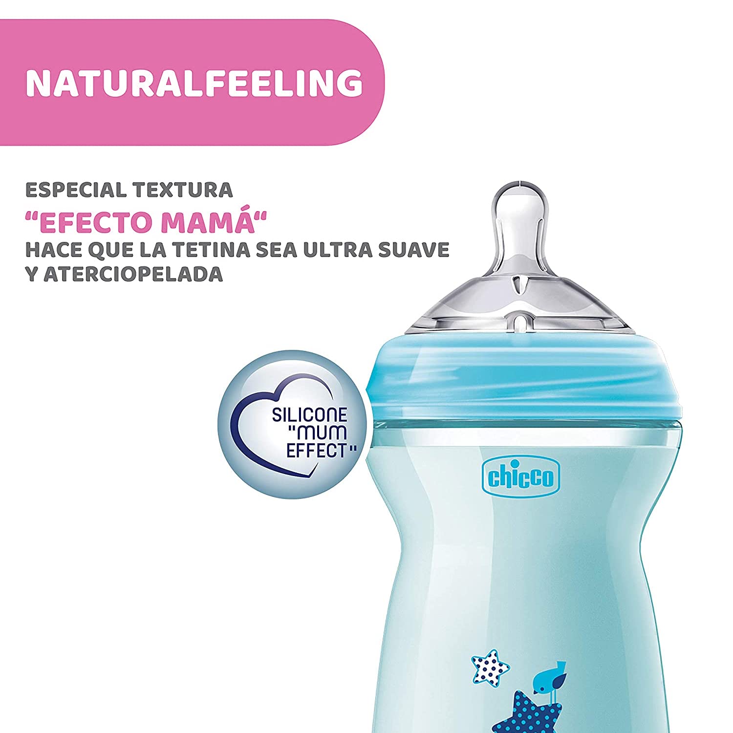 Chicco Natural Feeling Bottle 6months + So like you, so natural for him NaturalFeeling is the only baby bottle line that follows the child's growth in the most natural way possible NaturalFeeling The only line of baby bottles that allows you to breastfeed your baby in a natural way, thanks to 3 different teats with specific forms depending on the age of the child (0m + 4m +, 6m +). In fact they change shape depending on the capacity of sucking the small: from the inclined pacifier for infants to that of the first months rounded to the elongated ideal for older babies. A specific teat, for each age group: Inclined to infants; Rounded for the first months; Elongated for larger. Double anti-colic valve: It reduces the risk of inglestione air, because of colic, and favors a peaceful lactation Silicon extra soft and fluffy basis: Simulate the most of the breast and gives the child a natural feeling during feeding