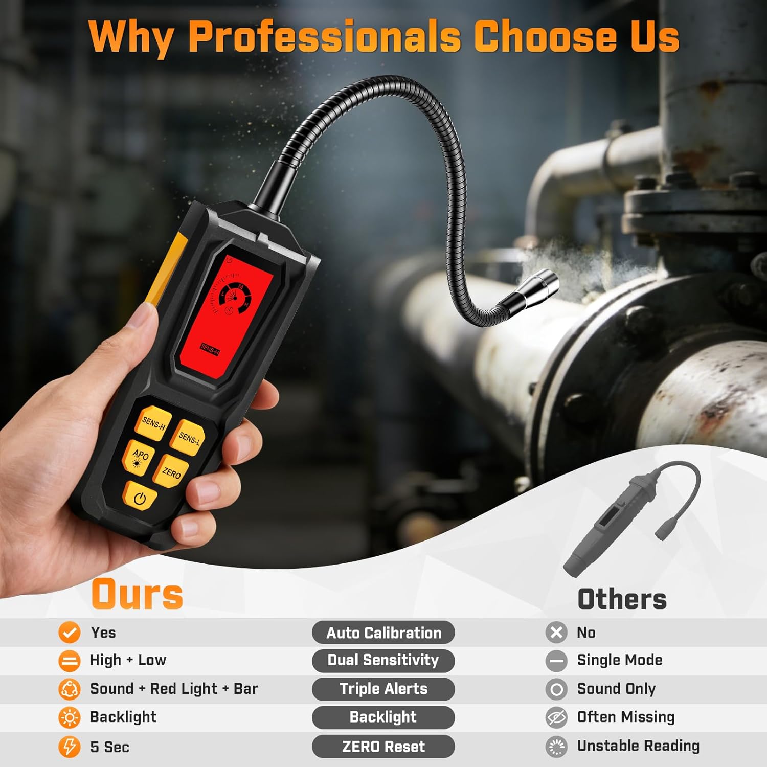 Installation is effortless: simply plug it into any standard outlet and it begins working instantly. No wiring, no tools, no wall damage. A built-in battery backup ensures the alarm stays active even during power outages—one of the most critical times for CO accidents due to generator use, winter heating, and poor ventilation. The bright, easy-to-read digital display allows you to visually monitor your home’s CO levels at any time, giving you clarity and peace of mind that basic beeping-only alarms can’t provide. When dangerous conditions occur, the device emits a strong 85dB siren designed to wake sleeping family members and alert you anywhere in your home. Built with a high-sensitivity sensor, this gas detectors for home natural gas detector quickly identifies combustible gases such as methane and propane, delivering immediate feedback when gas is present. The flexible gooseneck probe of the natural gas leak detector allows you to reach tight, hidden, or awkward spaces behind appliances, under sinks, along pipelines, and inside RV compartments, helping you pinpoint leak sources with greater accuracy. To ensure alerts are never missed, the smart gas leak detector for home features multiple alarm modes, including audible sound, visual indicators, and vibration alerts. Even in noisy environments or low-visibility areas, you’ll receive clear warnings the moment gas levels rise. The easy-to-read display of combustible gas detector provides stable, straightforward readings without complicated settings, making gas safety accessible for everyone.