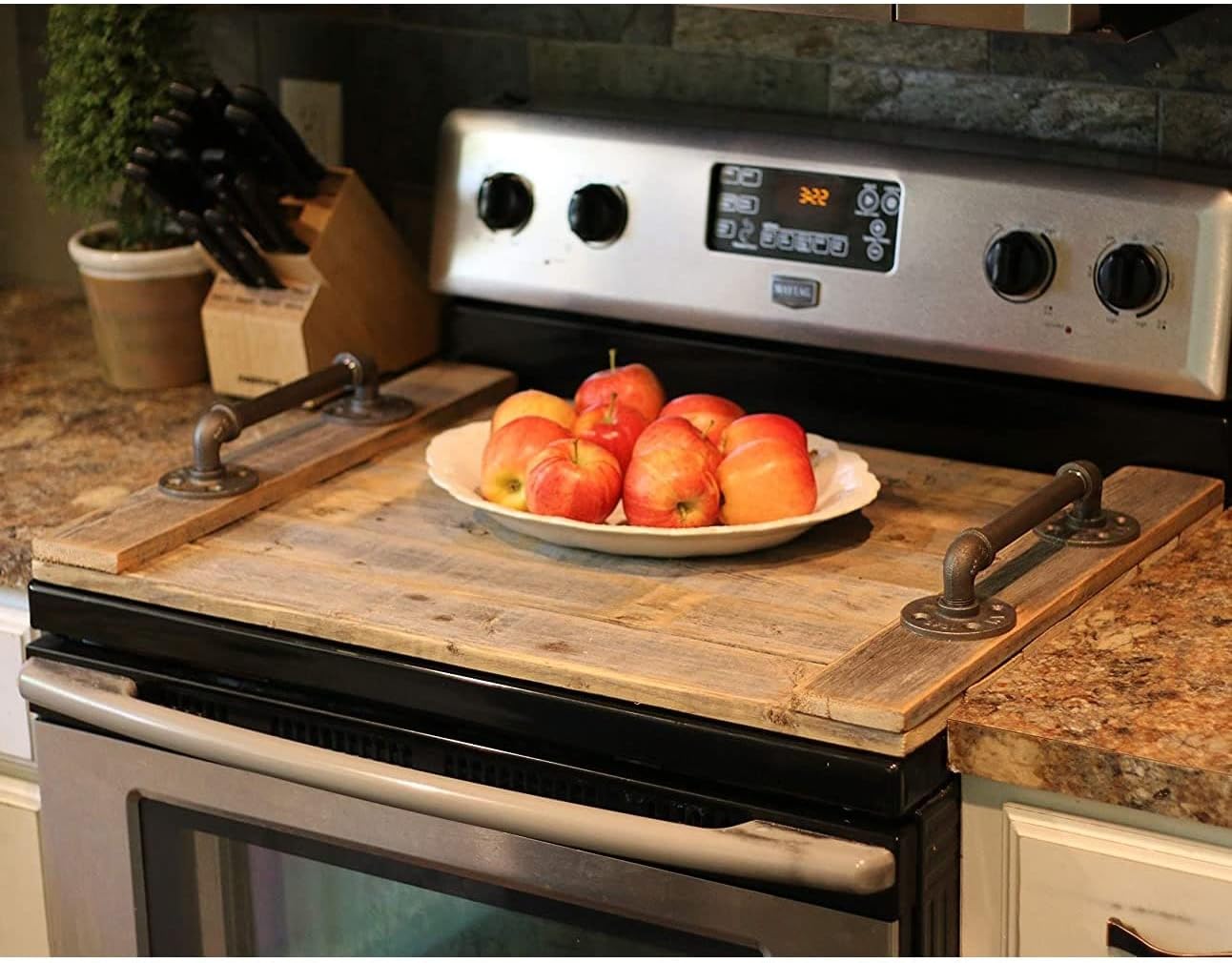 Our Stove Top Covers measure 29.5" Long x 21.5" Wide x 3.5" High and comes fully assembled with two raw metal pipe handles for some industrial flair. Each cover is made from reclaimed wood and and sanded for a clean finish. This is such a clever way to give your stove a face lift. Please keep in mind that this is reclaimed wood so old nail holes and cracks are a part of what adds the character to these one-of-a-kind pieces. No two pieces will be the exact same and occasional splinters may be present.