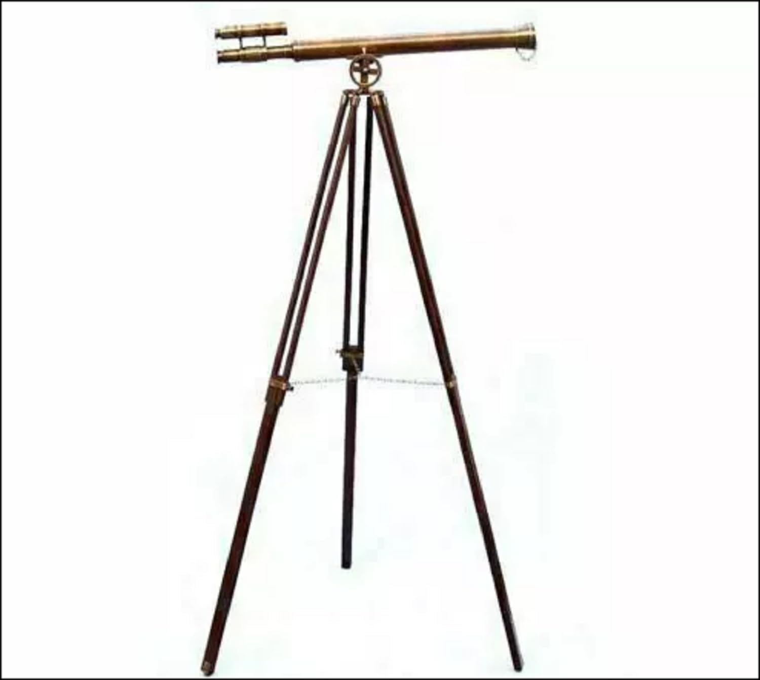"Experience the thrill of maritime navigation with this 39" nautical brass double barrel telescope. Inspired by classic sailing designs, this telescope combines functionality with decorative elegance. Perfect for sailors, collectors, and anyone who loves the sea." Size : Tripod maximum height 60 inches Ground Dia 25 Inch Telescope tube length 39 inches Magnification : 42 X magnification , these are antique replica models and we have set their magnification like it was there in original Antiques Tripod is made of wood to its original brown color