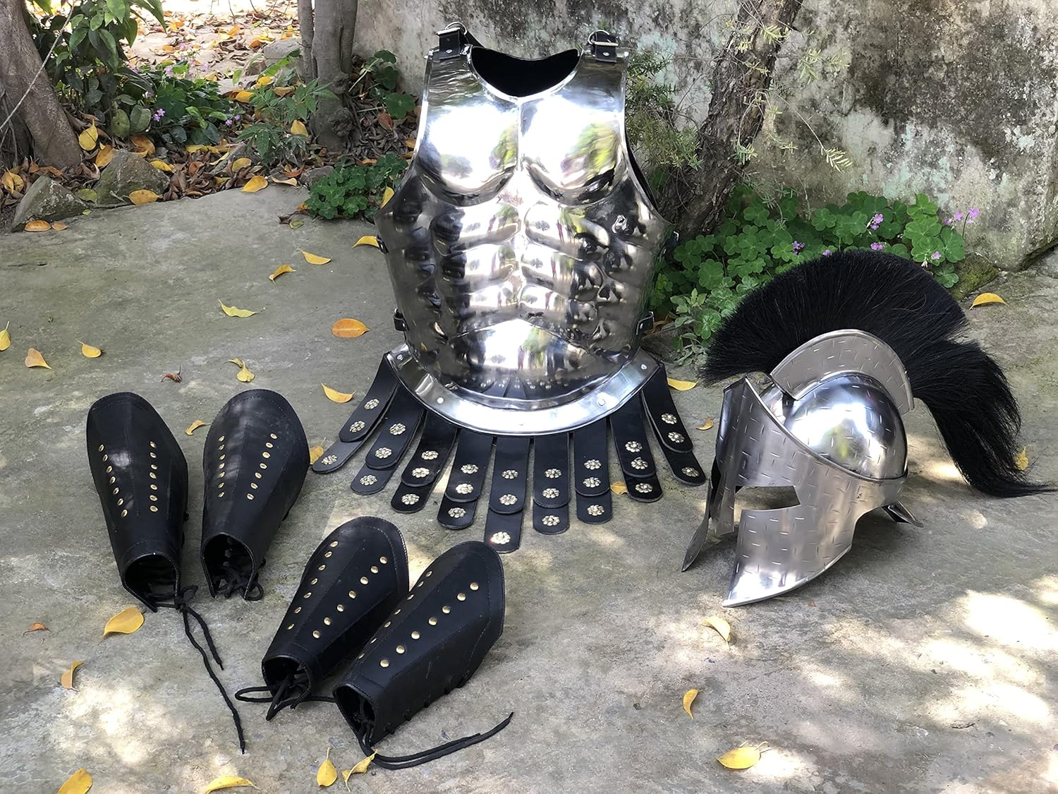 Made from 18 gauge steel & leather leg greaves arm bracers Chest Size: 46" Shoulder to Waist: 21" Neck to Waist: 19" Adult size wearable Halloween costume Product Details Helmet The Metal : 18 Gauge silver Finish M Iron Steel Plum : Black Plume Inner Diameter : Front to back 8 inches (approx) Ear to Ear : 7 inches (approx) Height : 15 inches from top to bottom (approx) Circumference : 26 inches (approx) Size : standard size, fits almost all adults