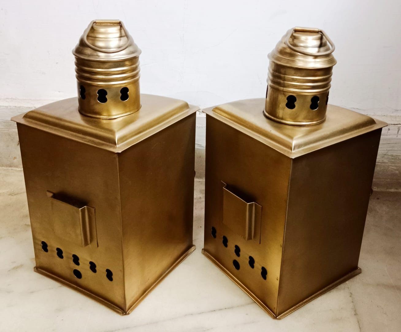 Add authentic maritime charm to your nautical collection with this exquisite pair of brass ship navigation lanterns. This matching set features port (red) and starboard (green) oil lamps, meticulously crafted in traditional nautical style. Each lantern stands 12 inches tall, 6 inches wide, and 4.75 inches deep, making them substantial decorative pieces. The polished brass construction showcases beautiful details including ribbed tops, ventilation holes, and hinged access doors. The colored glass panels maintain their historical significance - red for port side and green for starboard side navigation. These oil lamps feature practical design elements like secure closures and hanging rings at the top. Whether displayed as decorative pieces in a maritime-themed room or used as functional lighting, these lanterns bring genuine seafaring heritage to any space. Perfect for collectors, boat enthusiasts, or anyone seeking distinctive nautical decor with historical authenticity.