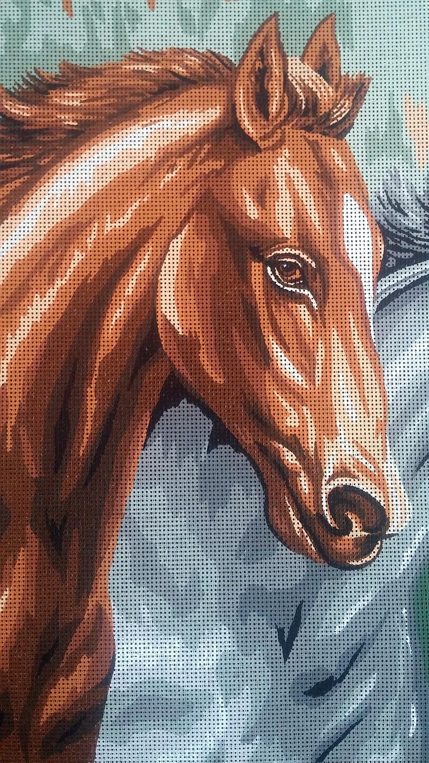 horses by Gobelin l is a printed needlepoint on a 100% cotton canvas of the highest quality canvas mess size is 10 dual weave penelope needleopint does not include floss or wool